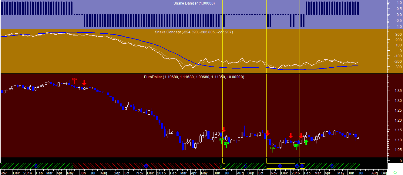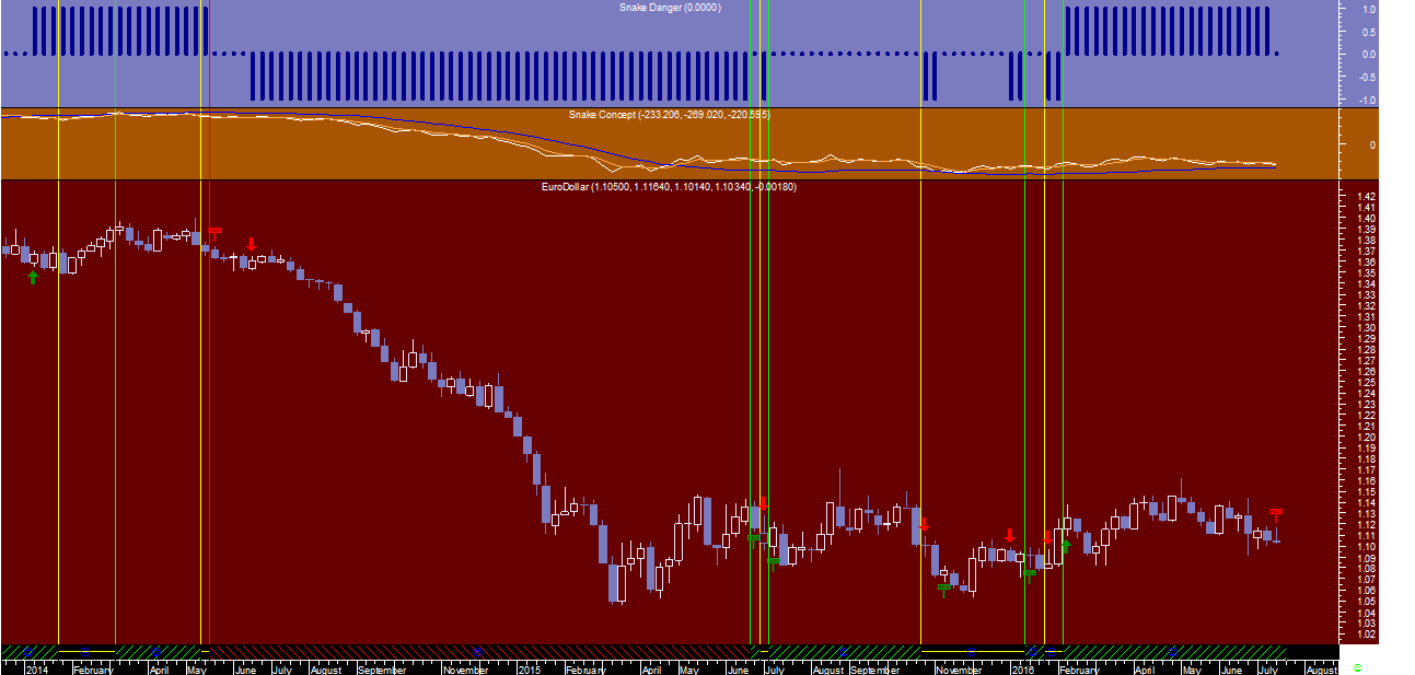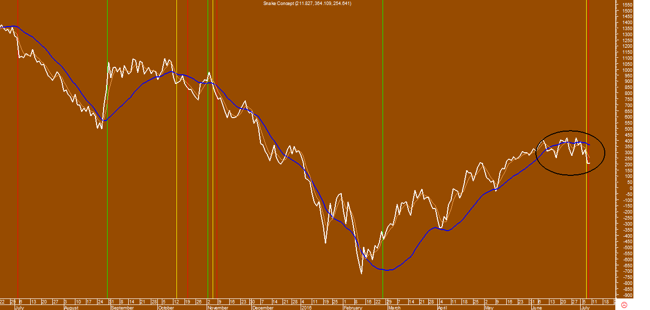 O gráfico acima mostra uma pequena ampliação dos indicadores da “Cobra” que comprovam a validade com alguma significância do sinal de venda do gráfico, atendendo por um lado ao sentido descendente do indicador azul que mostra o provável caminho futuro das cotações e o aumento da volatilidade, materializado pela diferença a aumentar entre a distância dos indicadores branco e azul.