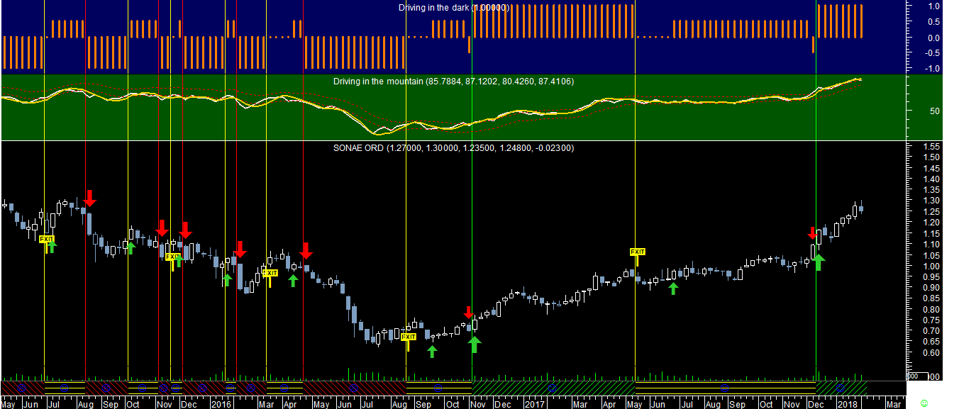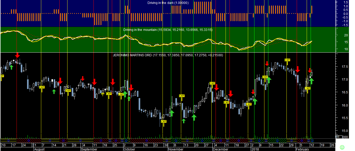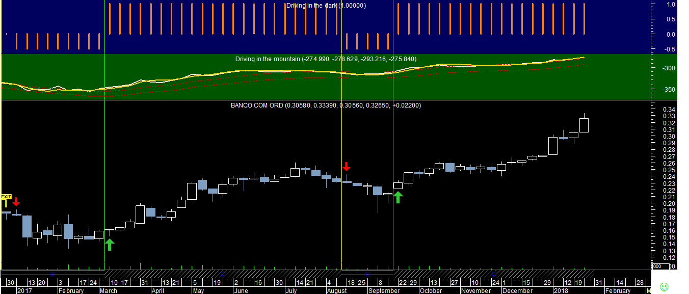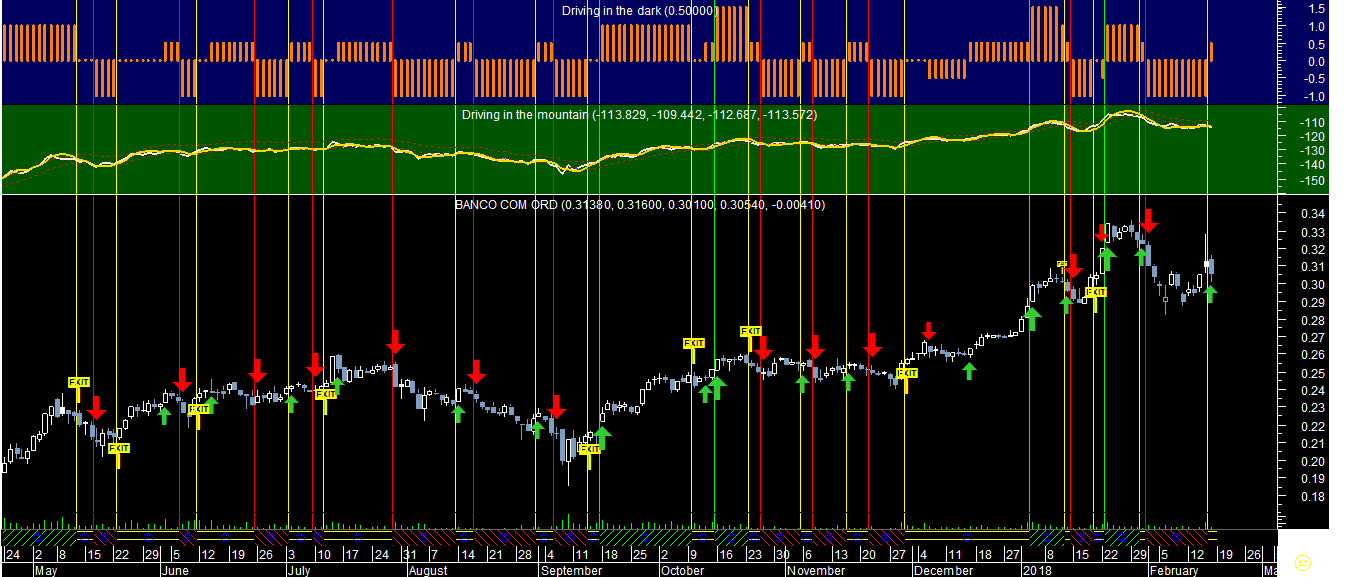 Como recentemente falei do sistema Driving in the Dark, junto também um gráfico deste sistema de trading oscilatório relativo ao respetivo gráfico semanal do BCP com os sinais gerados nesse contexto.