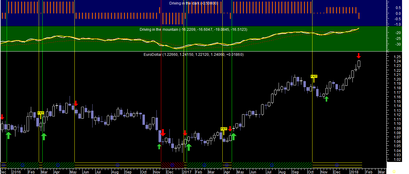 Para além do gráfico sobre este par, acrescento também um gráfico curioso do EuroDólar onde o sistema oscilatório dispara um sinal de venda sem que nada aparentemente o fizesse prever, uma vez que continua cheio de força. Haverá contudo que acrescentar que o EURUSD continua comprado porque a maioria dos restantes sistemas de trading continuam otimistas com posiçöes de compra.