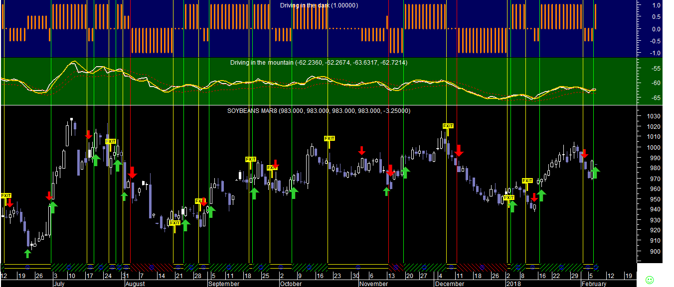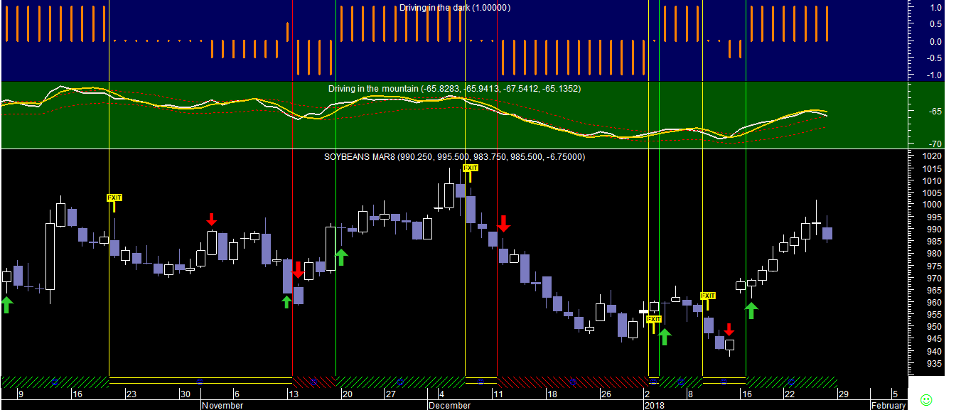 Deixo também ficar 3 gráficos com o sistema de trading de curto prazo de caráter oscilatório relativo a 1 índice e 2 commodities: S&P, Soja e Ouro.