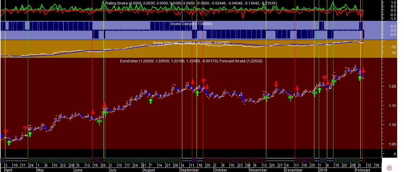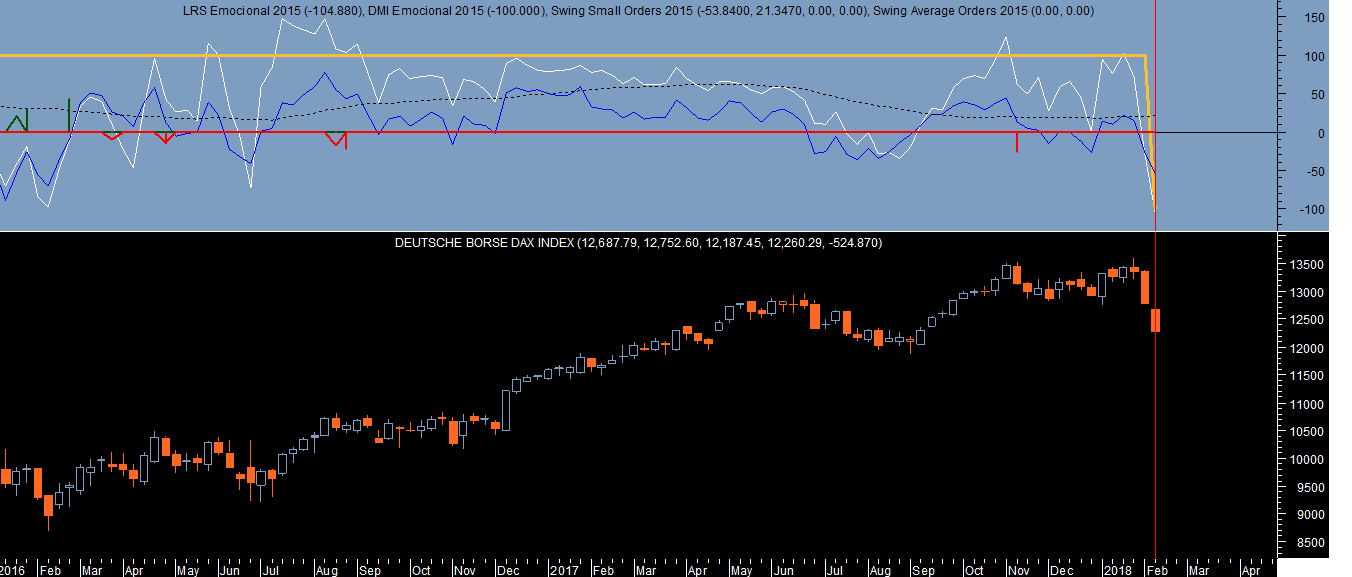 O primeiro gráfico abaixo é do DAX, o qual acaba de registar um agravamento da sua posiçäo neutra, que assim se mantém globalmente, por disparo de um novo sinal negativo no sistema Emocional na escala semanal. O segundo gráfico corresponde ao sinal definitivo que originou a saída no EURUSD.