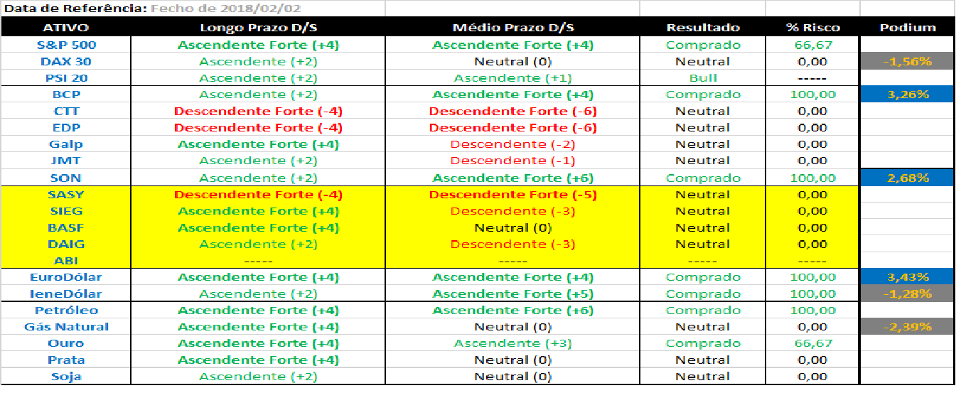 No seu conjunto o panorama no S&P apresenta um alerta ou um grande risco de passar brevemente a neutral, provavelmente por estar esticado em demasia numa zona de mini-tendência...neutral (zona definida por estar situada a seguir a uma linha vertical amarela). Basta olhar para o quadro de controlo e verificar que a força de rating atual do índice na zona dos sistemas entre médio e curto prazo é já nesta altura bastante fraca, apenas de +1 ponto, embora ainda se encontre positiva e portanto com uma resultante global de sinal longo.