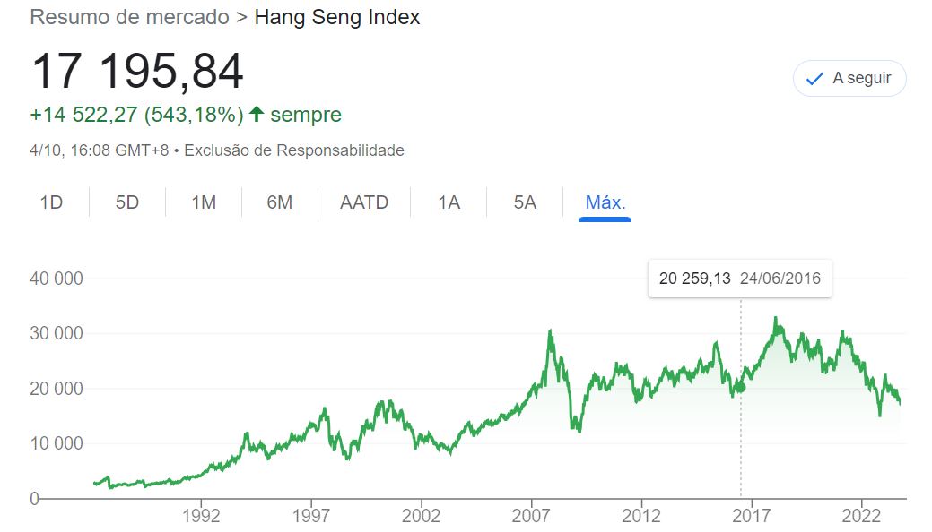 Lisboa_Casino Escreveu:Podes colocar aqui o indice Hangseng dos ultimos 30 anos------------- Cenário Dantesco desde 2021 e a
