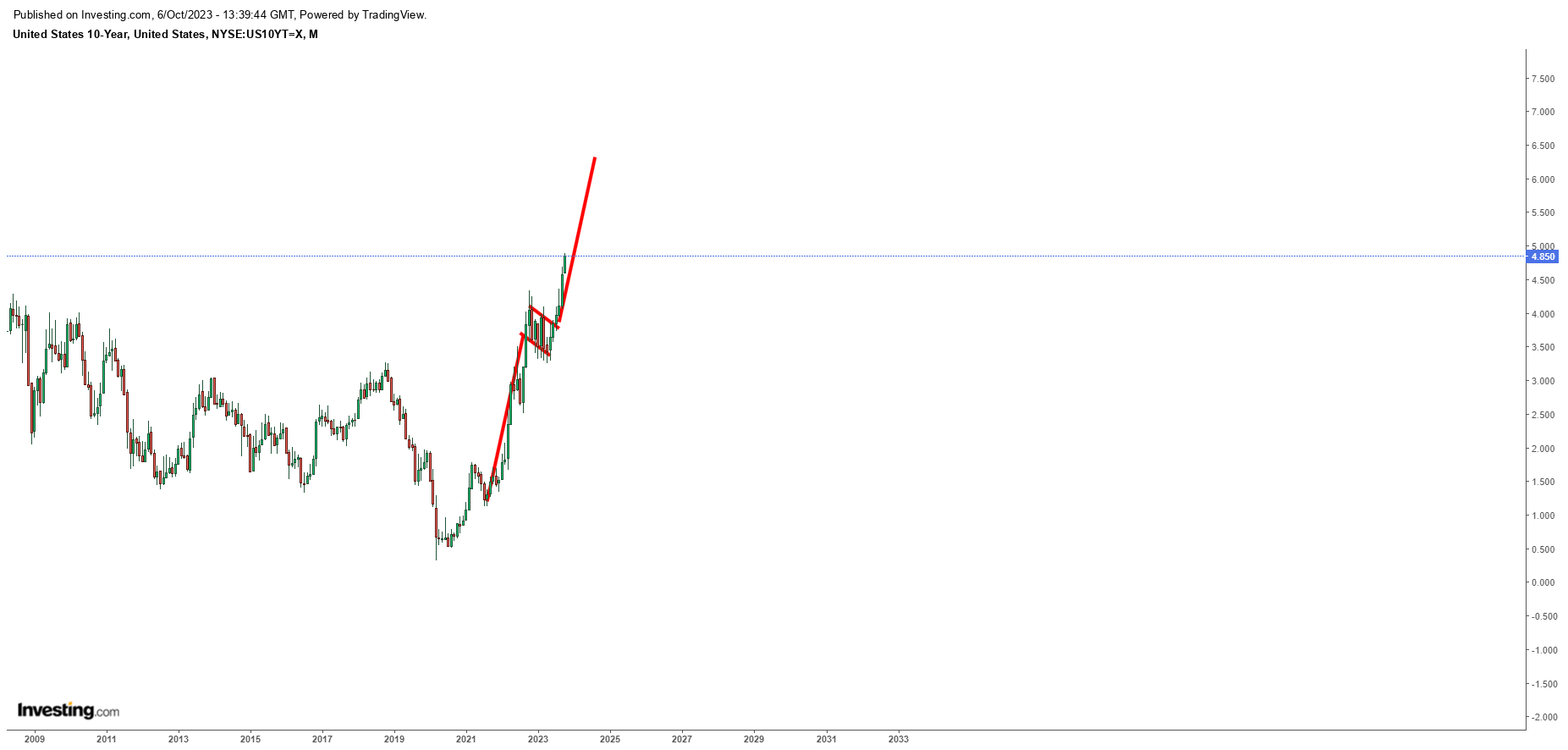 Os bonds dos USA de 10 anos têm uma bandeiraque dá projecção nos 6,2% se for com o ritmo actual seria o target atingido durante o verão do próximo ano.