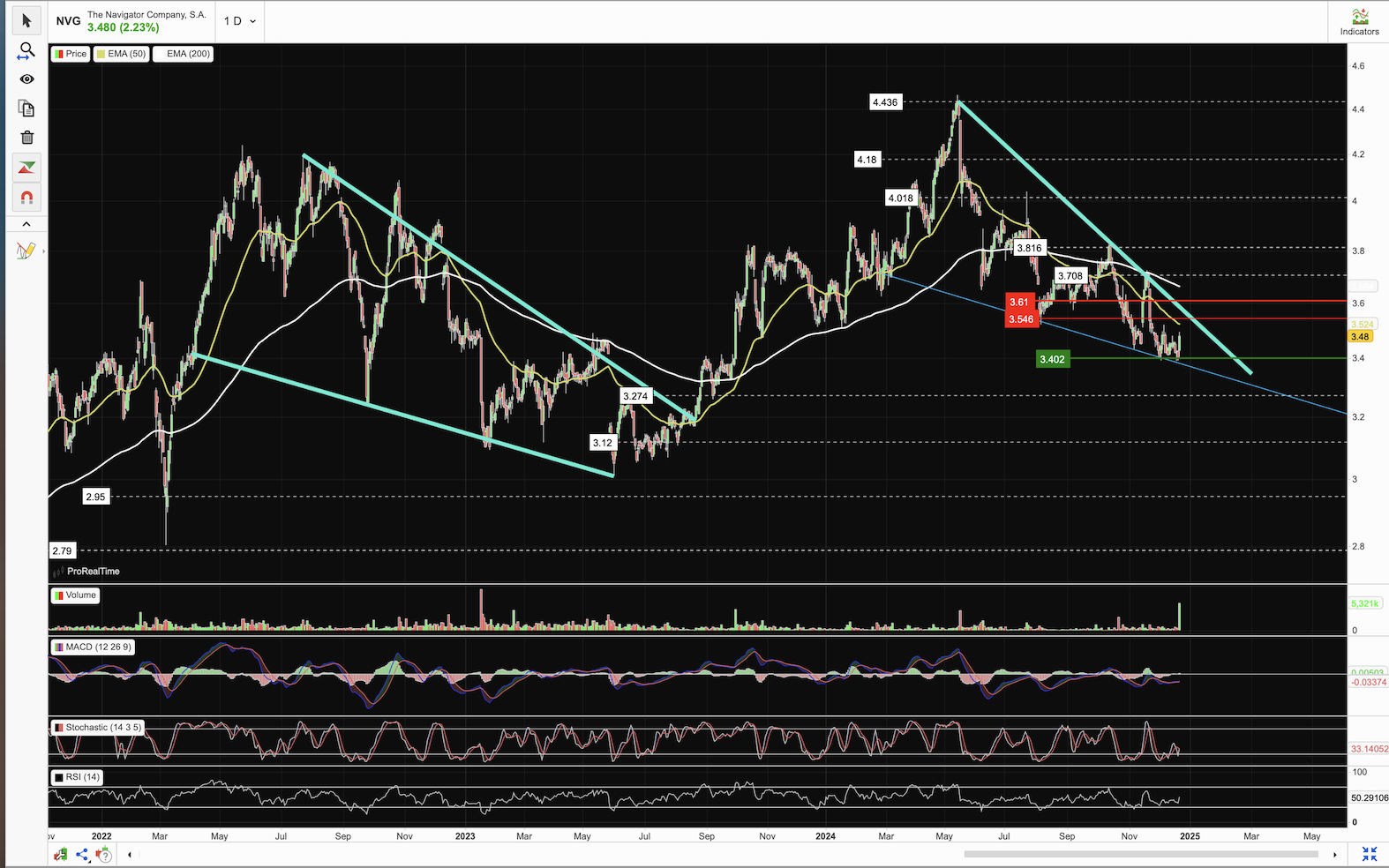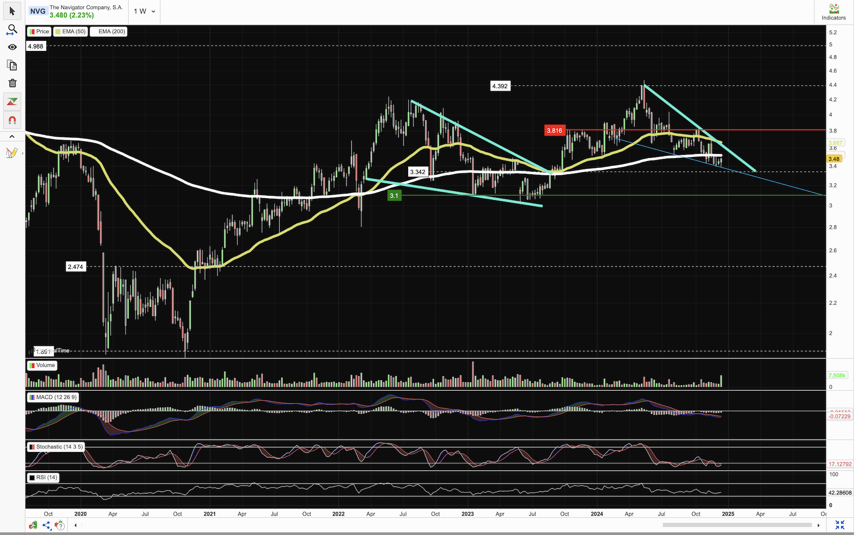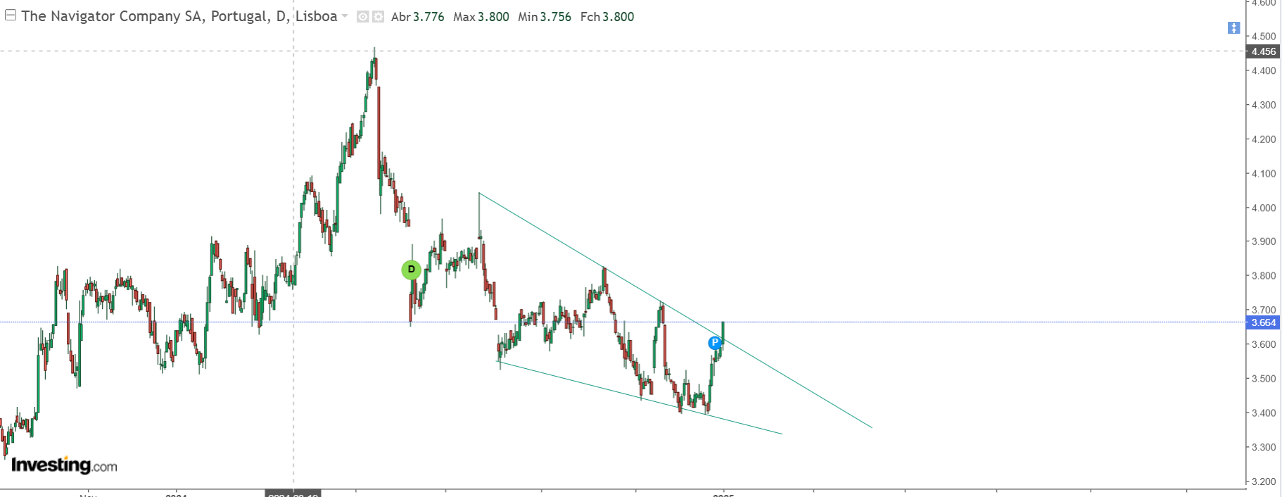 O cenário não me parece assim tão "rosado"...a NVG desde Maio último tem vido a fazer LL e LH's. E se há título onde tenho alguma dificuldade em identificar zonas evidentes de suporte/resistência é este. Se aí for o preço, na zona 3.00-3.20, serei comprador. Aqui é terra ninguém.