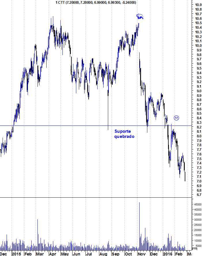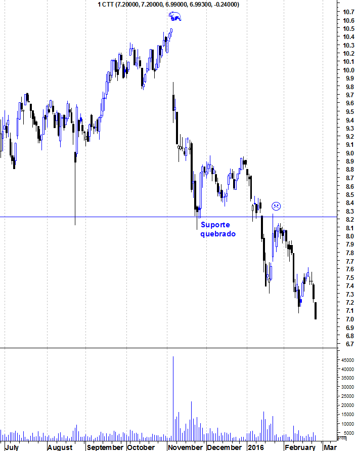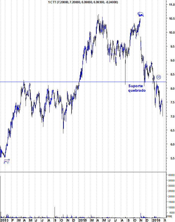 tiagopt2 Escreveu:Apesar do bom momento no curto prazo, as coisas não estão fáceis para os CTT. Desde a quebra do importante suporte nos 8,8€, que eu tinha já assinalado na última análise como sendo decisivo para o título no médio prazo, a quebra intensificou-se e atingiu já os 30% desde máximos. Muito significativo, se considerarmos que os CTT são um título relativamente defensivo. Neste movimento, desenhou uma linha de tendência de validade moderada. Atente-se contudo à angulação da mesma, que por ser muito pronunciada não deve ser tida em grande consideração. A sua quebra em alta representará, em teoria, pouco mais do que uma diminuição da velocidade de queda. Numa óptica de médio prazo, mais importante que a quebra em alta desta linha, será sem dúvida a superação dos 8,12€. Será esse o ponto que marca a fronteira entre o bear e o bull mode.