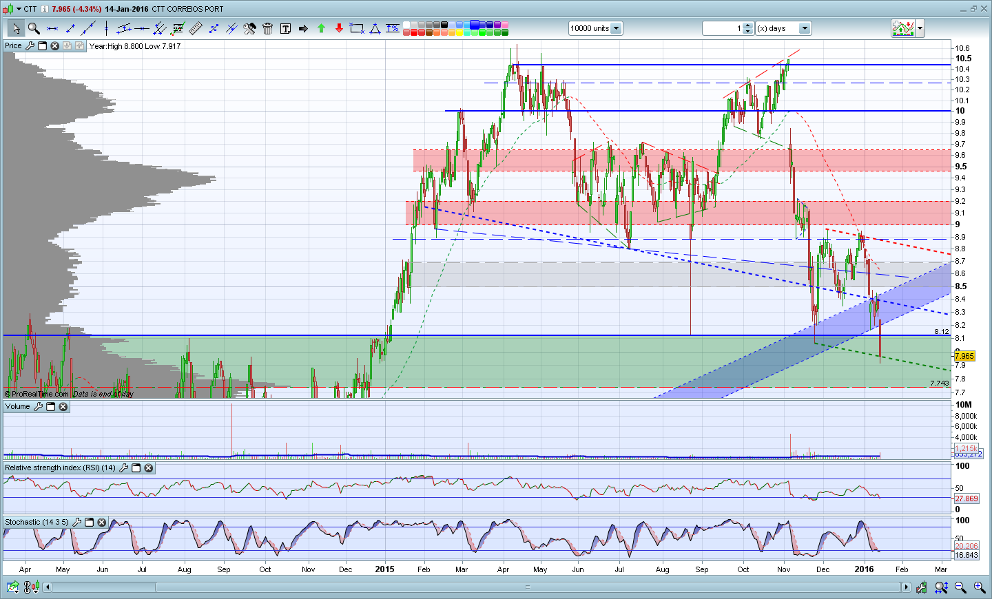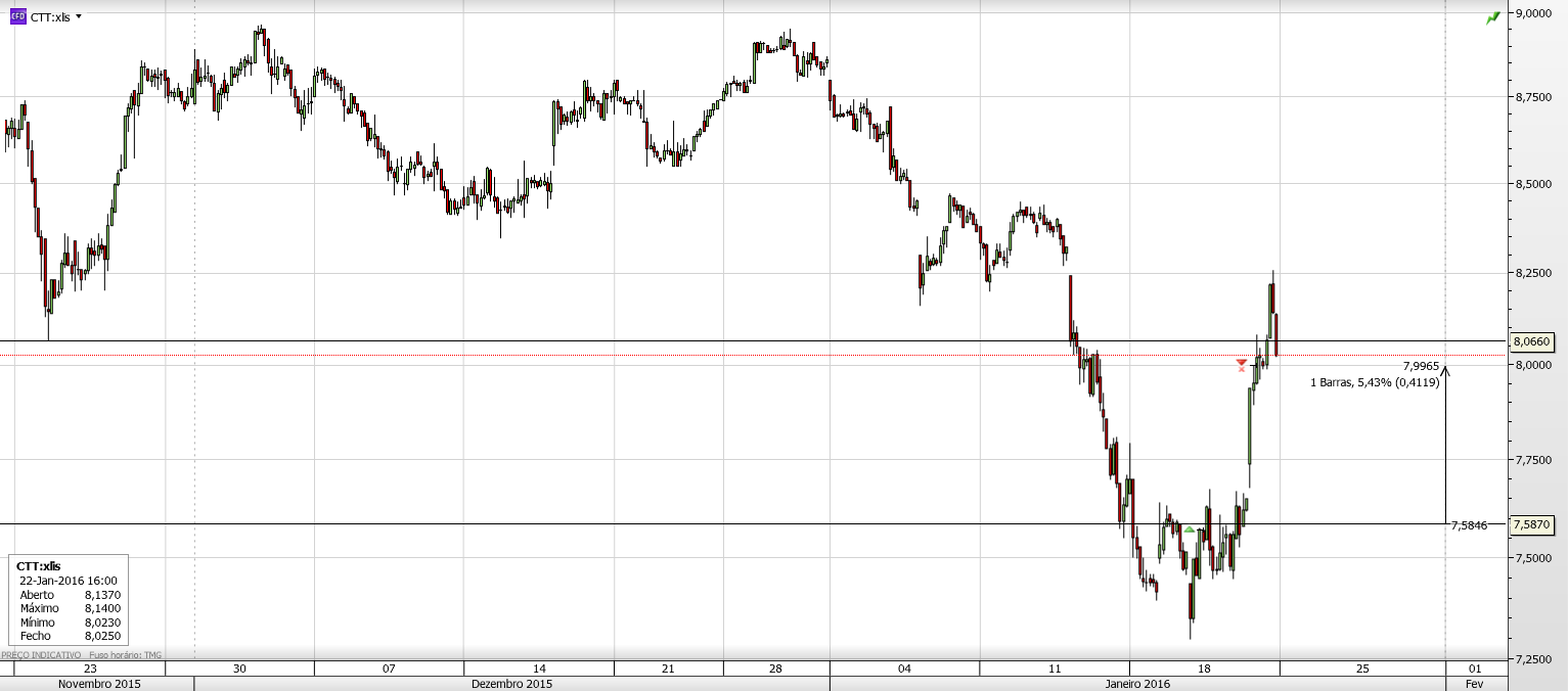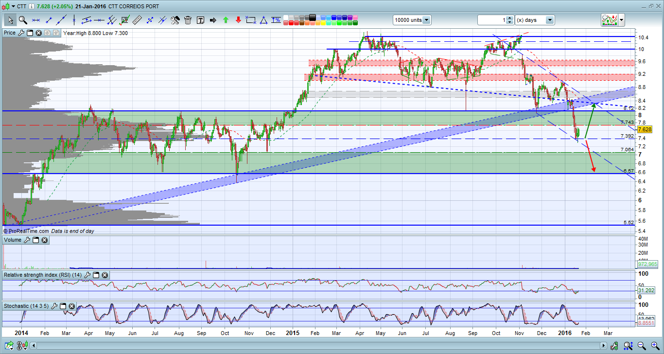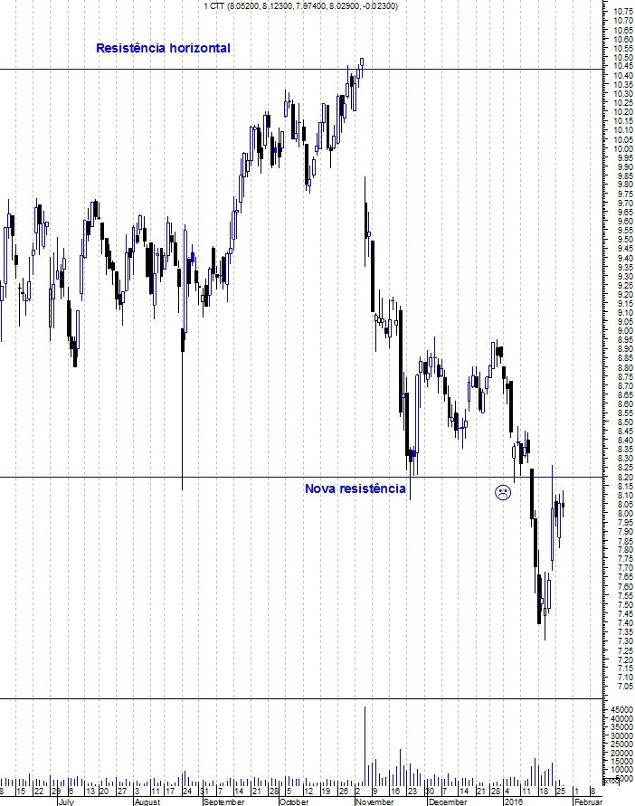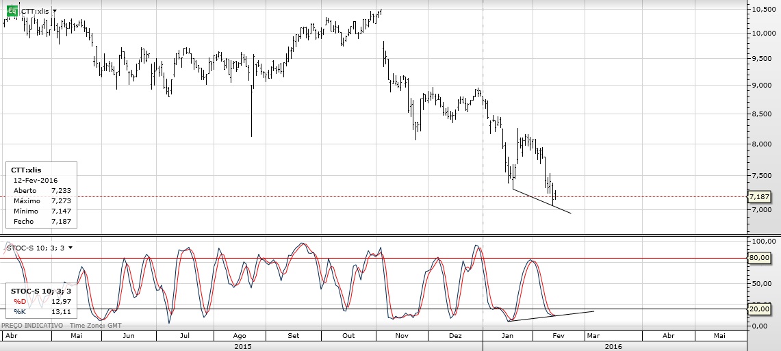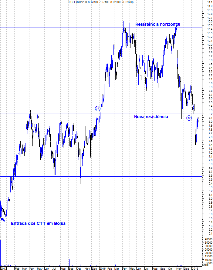 Pela primeira vez, desde a entrada dos CTT em Bolsa, os ursos conquistaram uma batalha importante, com a quebra do suporte horizontal dos 8,2 euros. Esse suporte tornou-se agora a principal resistência da acção e para que os touros voltem a poder ganhar o controlo da acção precisam de rimper, consistentemente, essa resistência.