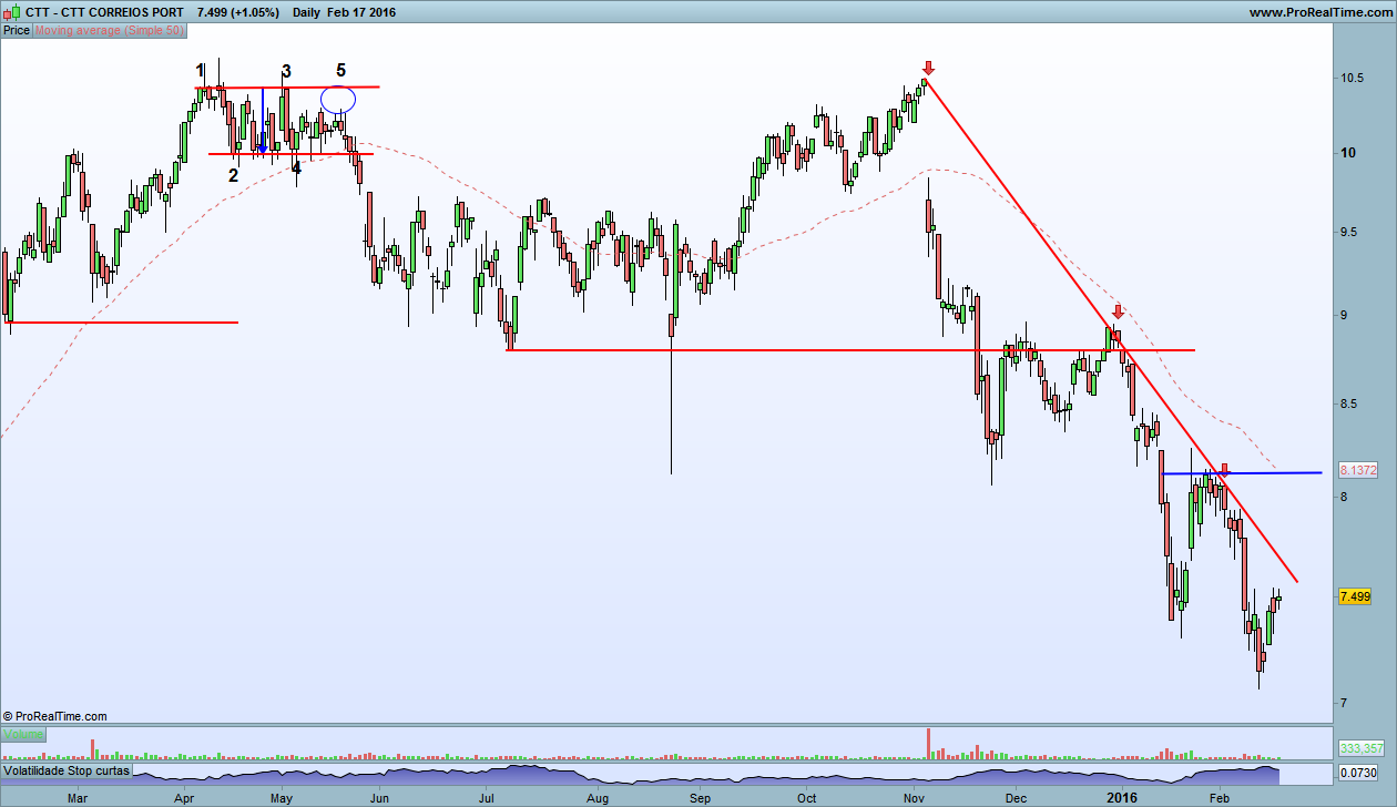 Apesar do bom momento no curto prazo, as coisas não estão fáceis para os CTT. Desde a quebra do importante suporte nos 8,8€, que eu tinha já assinalado na última análise como sendo decisivo para o título no médio prazo, a quebra intensificou-se e atingiu já os 30% desde máximos. Muito significativo, se considerarmos que os CTT são um título relativamente defensivo. Neste movimento, desenhou uma linha de tendência de validade moderada. Atente-se contudo à angulação da mesma, que por ser muito pronunciada não deve ser tida em grande consideração. A sua quebra em alta representará, em teoria, pouco mais do que uma diminuição da velocidade de queda. Numa óptica de médio prazo, mais importante que a quebra em alta desta linha, será sem dúvida a superação dos 8,12€. Será esse o ponto que marca a fronteira entre o bear e o bull mode.
