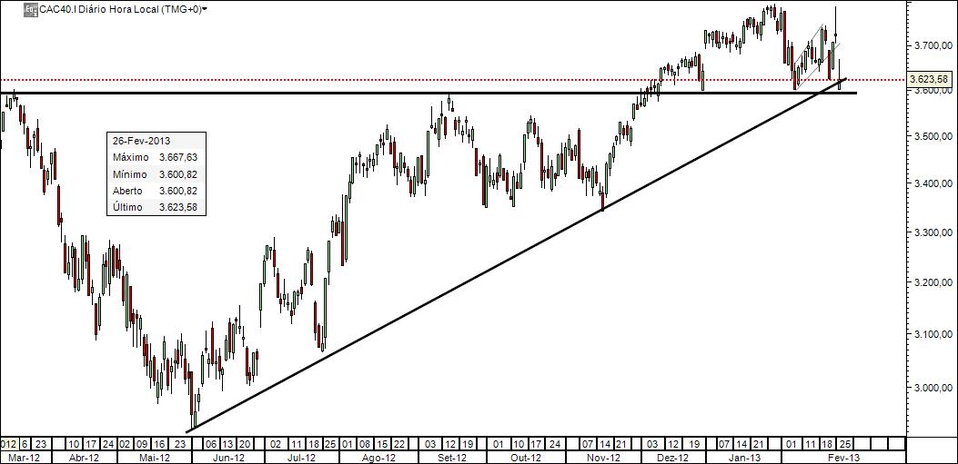 Depois da anterior reacção aos ~3600 referenciada no dia 7/2 e da subida após essa data, a incerteza na Itália "atirou" de novo o CAC40 até aos ~3600, tendo novamente reagido bem.