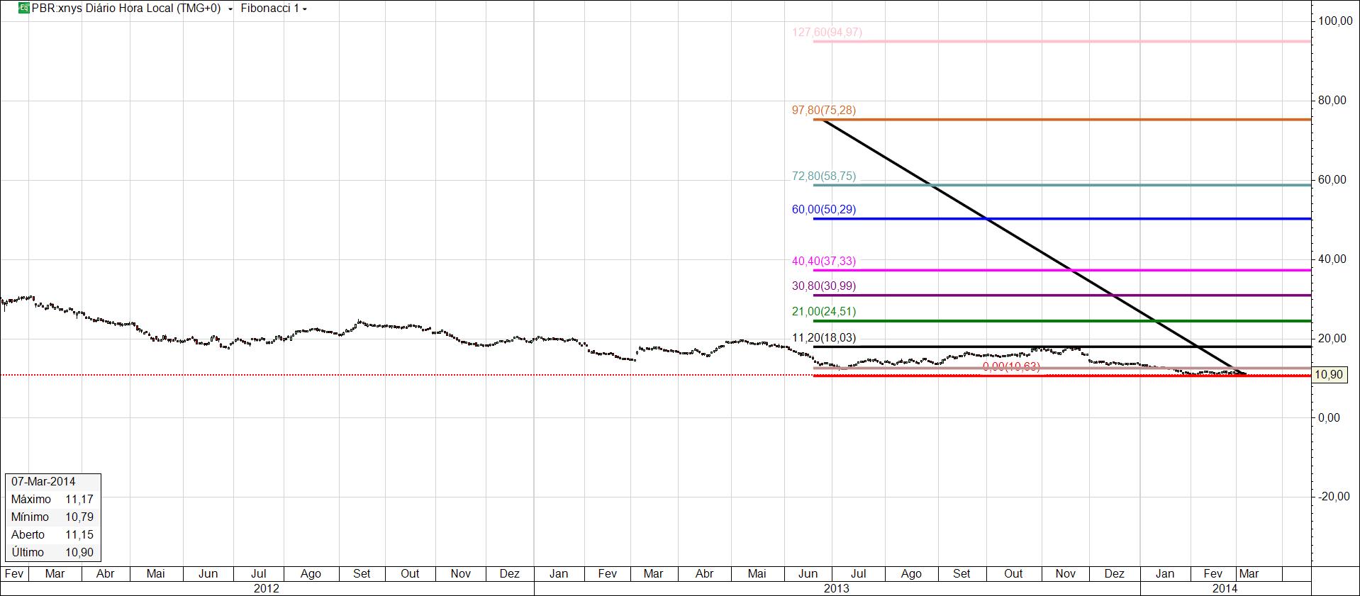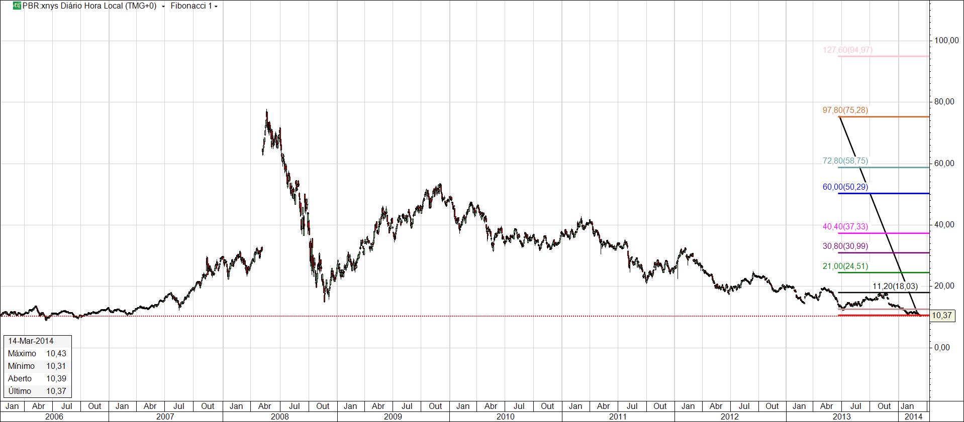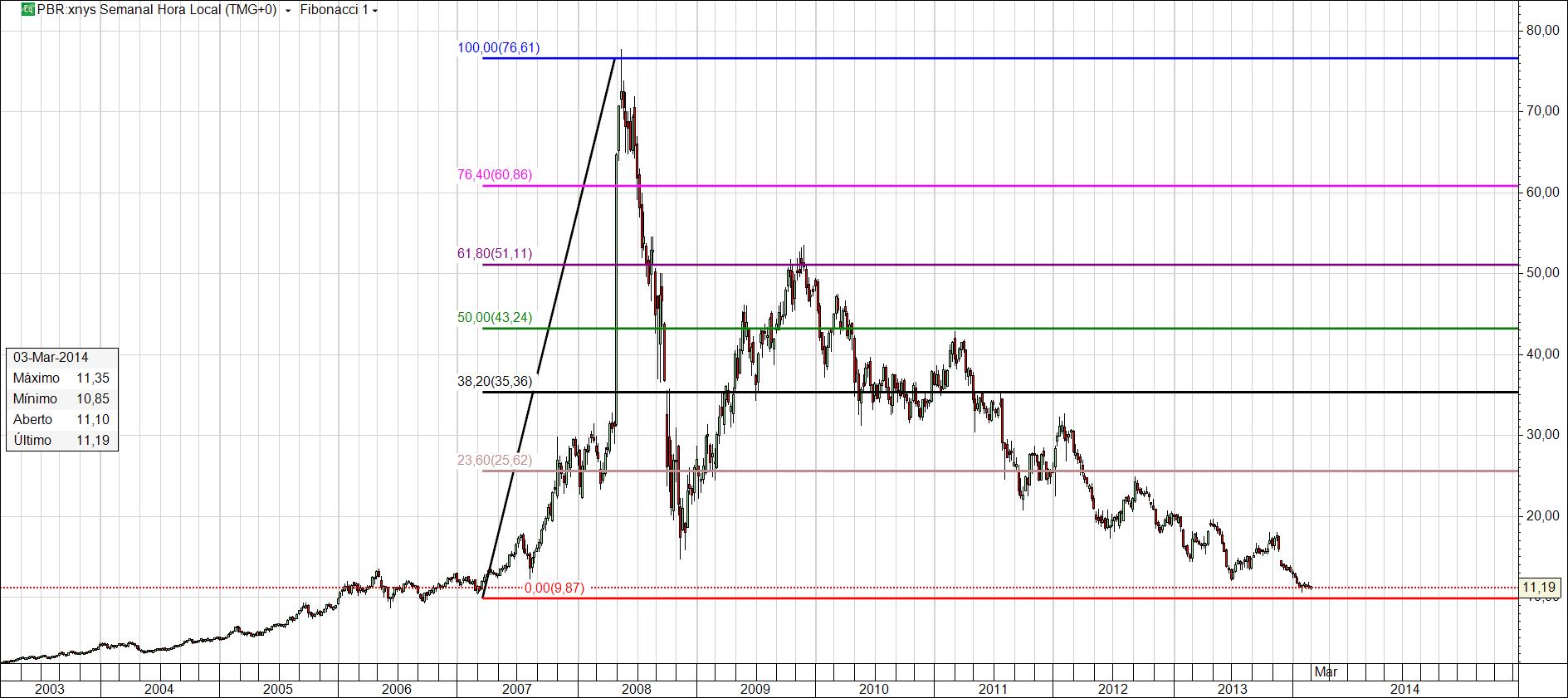 O fibonacci traçado vai buscar 2005/7, apenas as duas primeiras linhas que analisei, as outras bem...o tempo vai dizer o quanto valerá estuda-las.Assim o preço de 10,90 USD, é o suporte de jan2005 até jan2007 quando então a PBR inicia ligeiras subidas, esse momento foi inicio do PAC, novos plafons de investimento, a vontade politica de novos governos e as próprias necessidades dos derivados do petróleo.