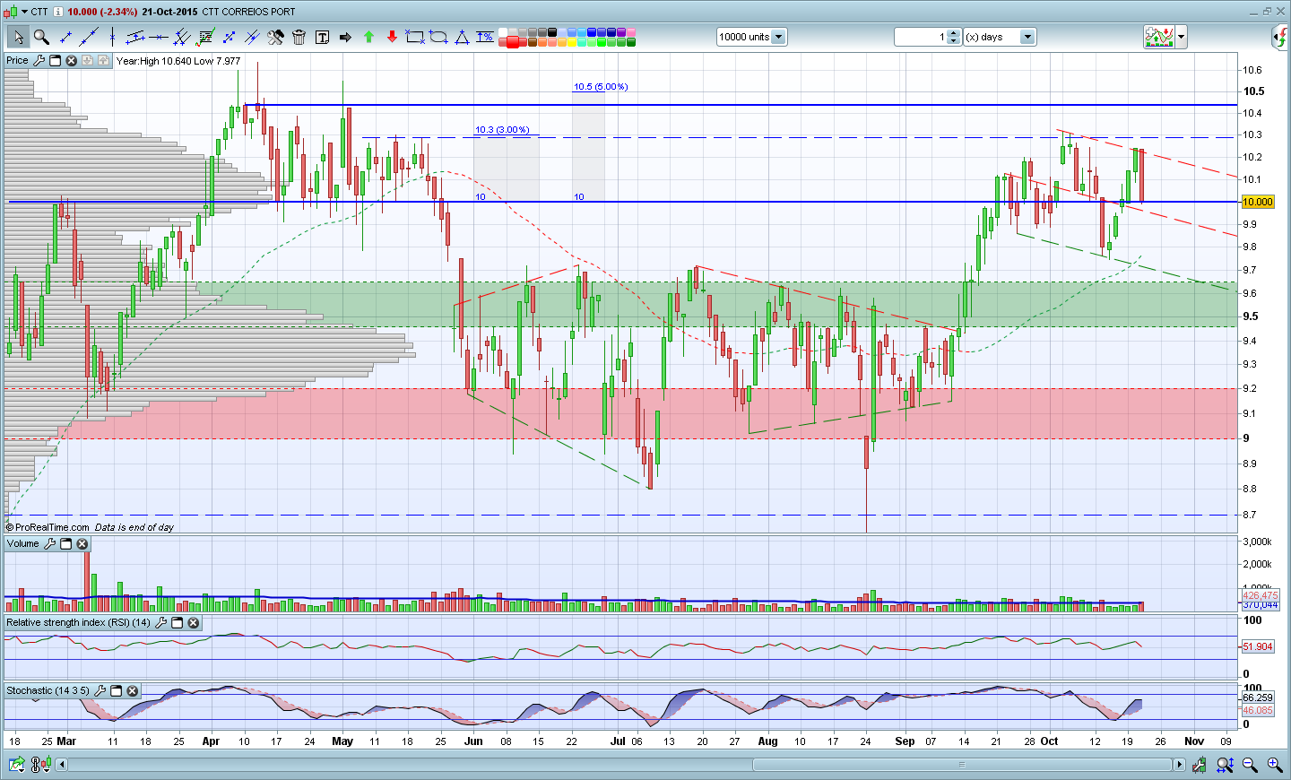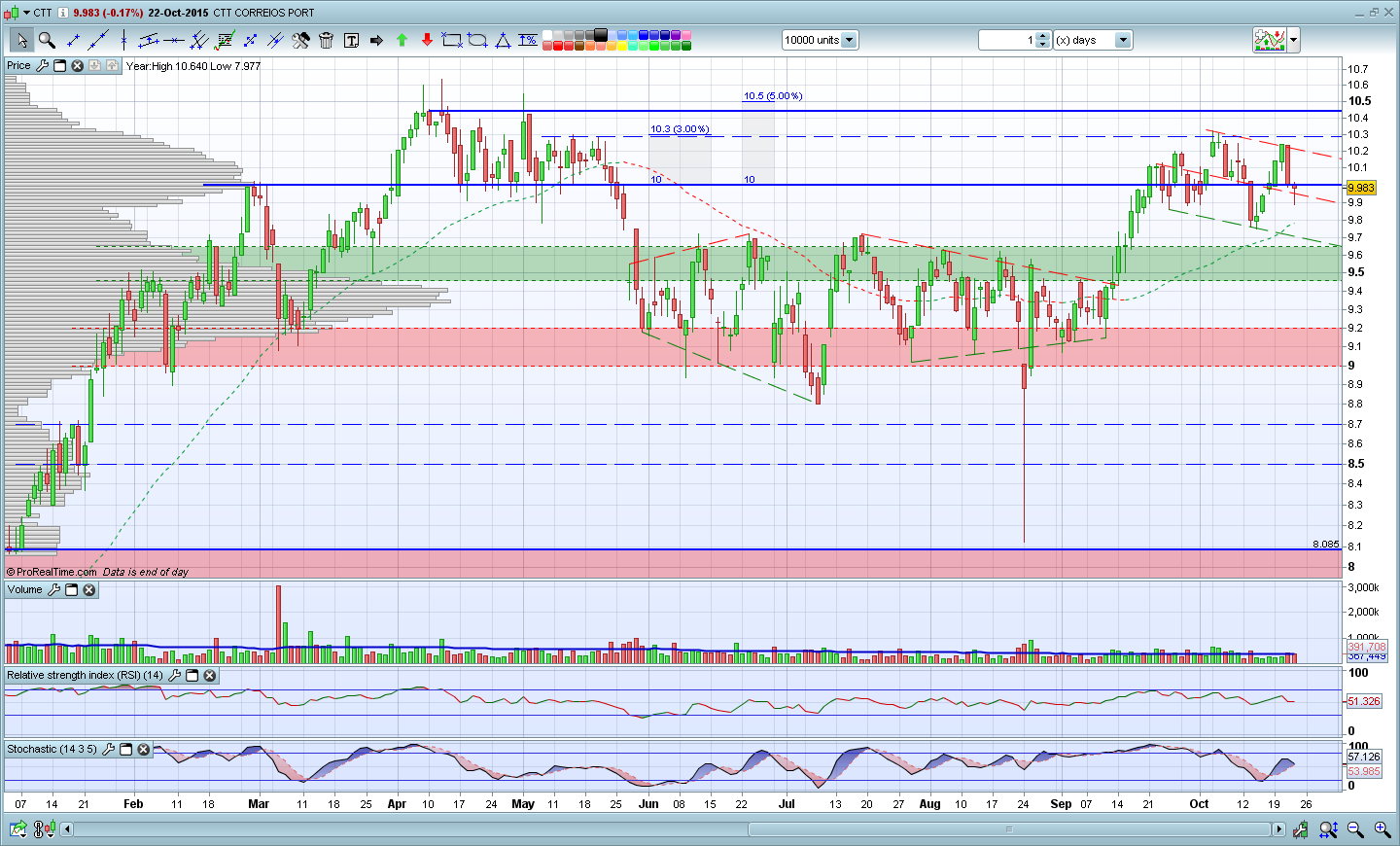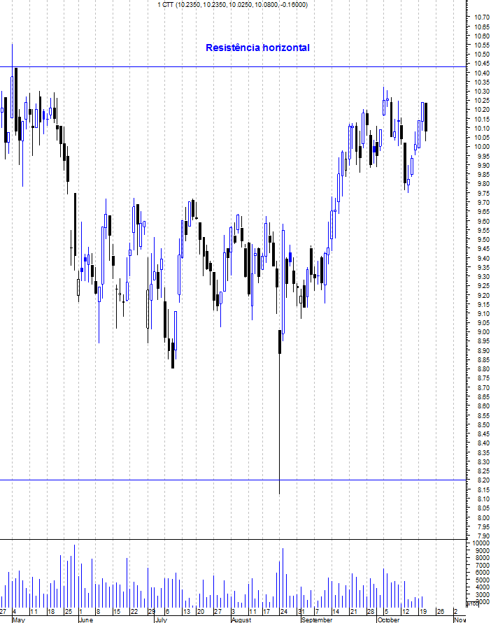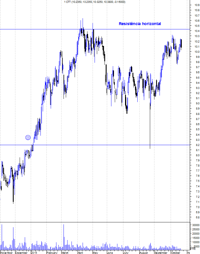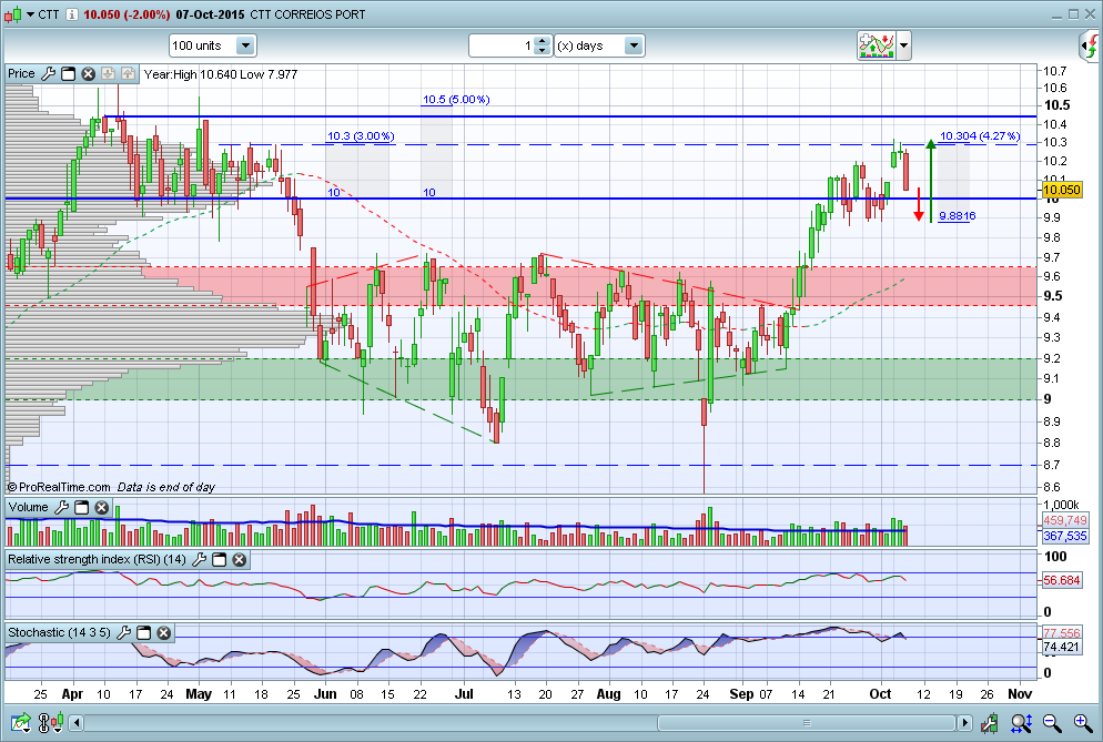 Como tal, não despi ainda ao meu fato de touro nos CTT. No entanto, se me perguntassem se era agora uma boa altura para comprar a acção, não responderia afirmativamente. O título encontra-se muito próximo de uma importante zona de resistência entre os 10,4 e os 10,5 euros. Além de ter travado a subida da acção em Abril e Maio deste ano, corresponde também ao máximo histórico que é sempre uma forte resistência em qualquer acção. Por isso, penso que quem entrar na acção deve esperar por 2 cenários: Ou uma retracção (as retracções têm sido excelentes oportunidades de compra na acção) ou uma ruptura da resistência que seria um forte sinal de força e abriria espaço para novos voos.