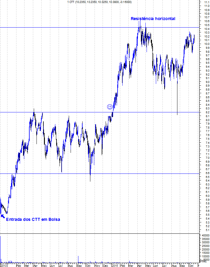 Ao longo destes quase 2 anos da vida dos CTT em Bolsa, a acção viveu períodos de lateralização, mas os ursos nunca estiveram – verdadeiramente – no comando da situação. Podemos mesmo afirmar que os CTT nunca viveram um “Bear Market” em Bolsa. É verdade que isso terá que acontecer um dia, mas estar a antecipar esse momento, é estar a remar contra a corrente e a desaproveitar a força das águas que o levam para cima.