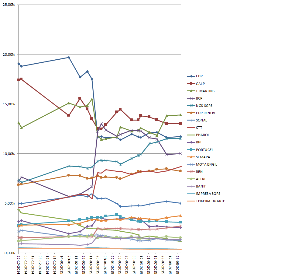 Em agosto de 2015, o índice PSI-20 encerrou nos 5.261,15 pontos, menos 8,0% do que em julho e menos 11,5% do que no período homólogo de 2014. A Jerónimo Martins (13,78%), a Galp (12,91%), e a EDP (11,70%) foram os emitentes com maior representatividade no índice.