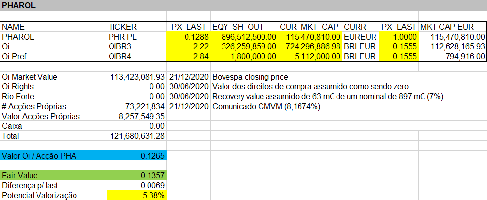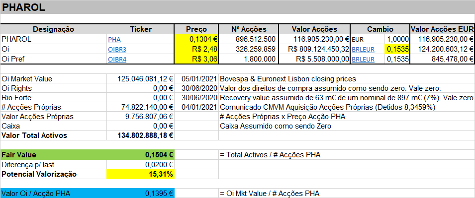 O "fair price" da PHA mantém-se inalterado em relação a 31/Dez/2020, uma vez que não houve nenhum novo anúncio e a cotação do real face ao EUR manteve-se.