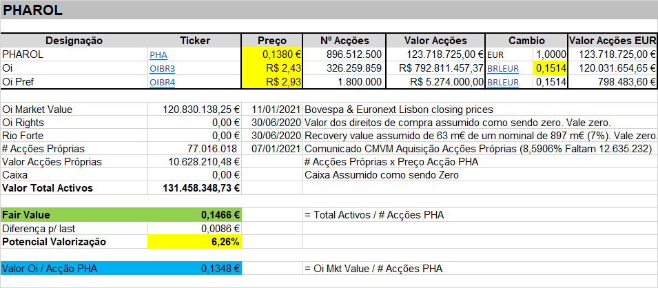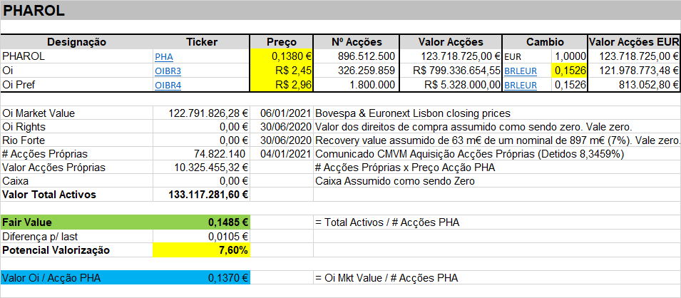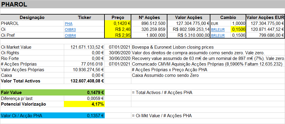 Quadro-resumo abaixo, com indicação do fair value da PHA, isto é, onde ela deveria estar a cotar tendo em conta o valor dos activos detidos, explicados no quadro.