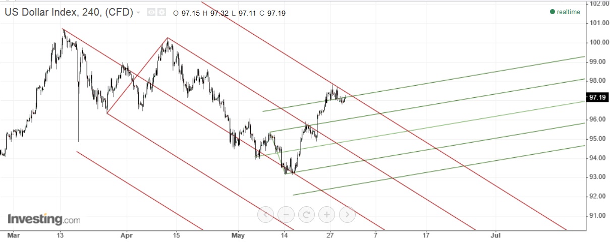 e olhando para o gráfico 1, é fácil constatar que, ou passa as WLs das forks vermelha e verde em zona de resistência (bullish flag?), ou não passa (o tal "ou boi ou vaca"), pelo que, obviamente, a hipótese do gráfico 2 (postada há 1s dias) se mantém na calha... no entanto, em zona de 2WL + resistência, o us dollar index não está em zona fácil para longos. digo isto tb pela forma como o preço está a reagir ao conjunto das 2 WLs, diferente da que imaginei inicialmente.