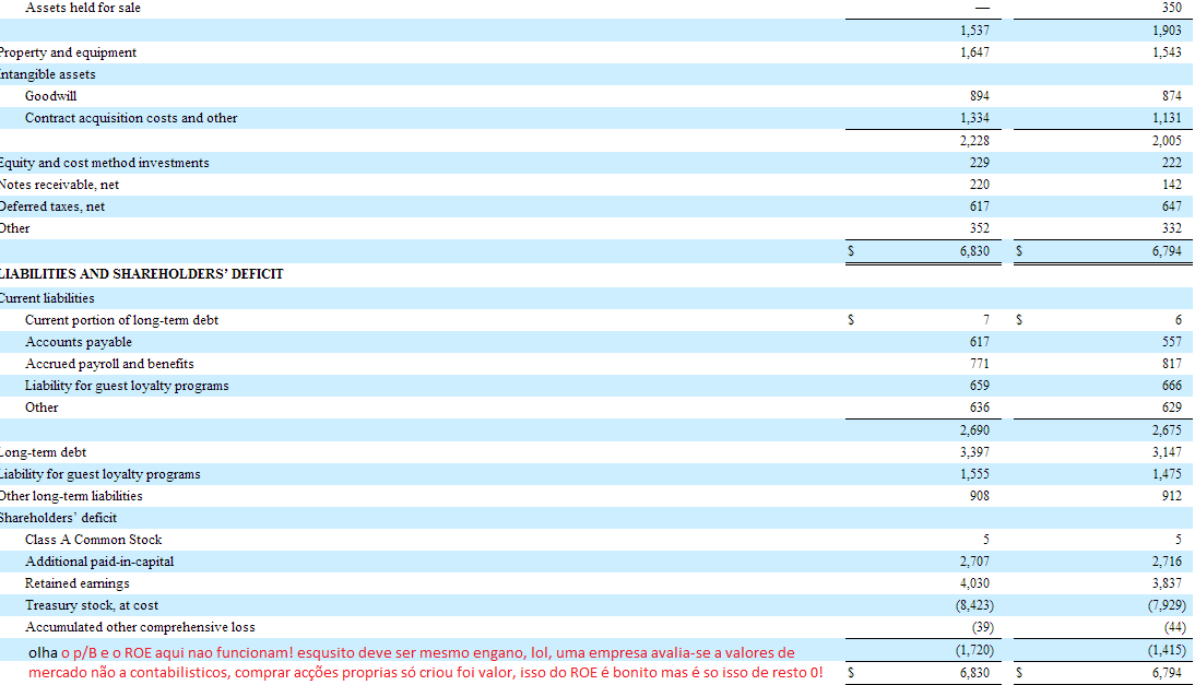 management agressivo tanto nos guidances, como na forma de retribuição ao acionista que passa por comprar muitas acções proprias acima até do montante que a geração de cash flow permitiria no entanto a divida liquida a meu ver apresenta valores normais, será de facto extranho para quem gosta de fazer analise de contabilidade a dizer que é fundamental, uma empresa com a equity negativa valer tanto em bolsa até face ao invested capital, no entanto fixem isto bem e é por isso mesmo que eu fui buscar a marriot OS ATIVOS DE UMA EMPRESA TEM O VALOR QUE O MERCADO LHE ATRIBUI, uma empresa pode valer o mesmo mais ou menos que o seu book value dái decorre 0! esse racio é o pior de todos pior ainda que o per. Assim nessa teoria a decisão da empresa recomprar acções proprias criando um shareholder's deficit contabilistico era péssima , quando na verdade foi de génio dado que as acções estavam muito baratas esta industria rege-se por ciclos, nao tem book value