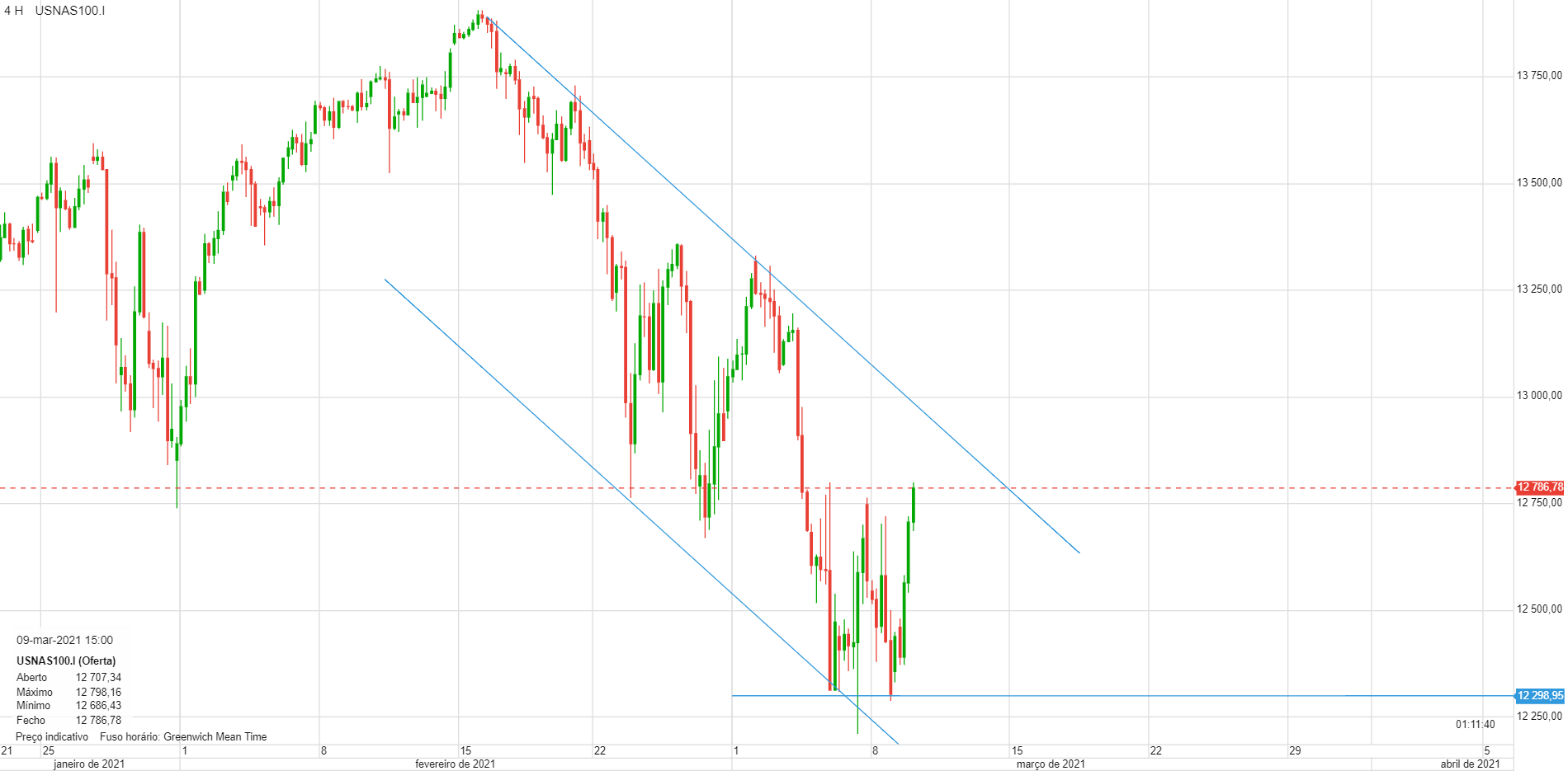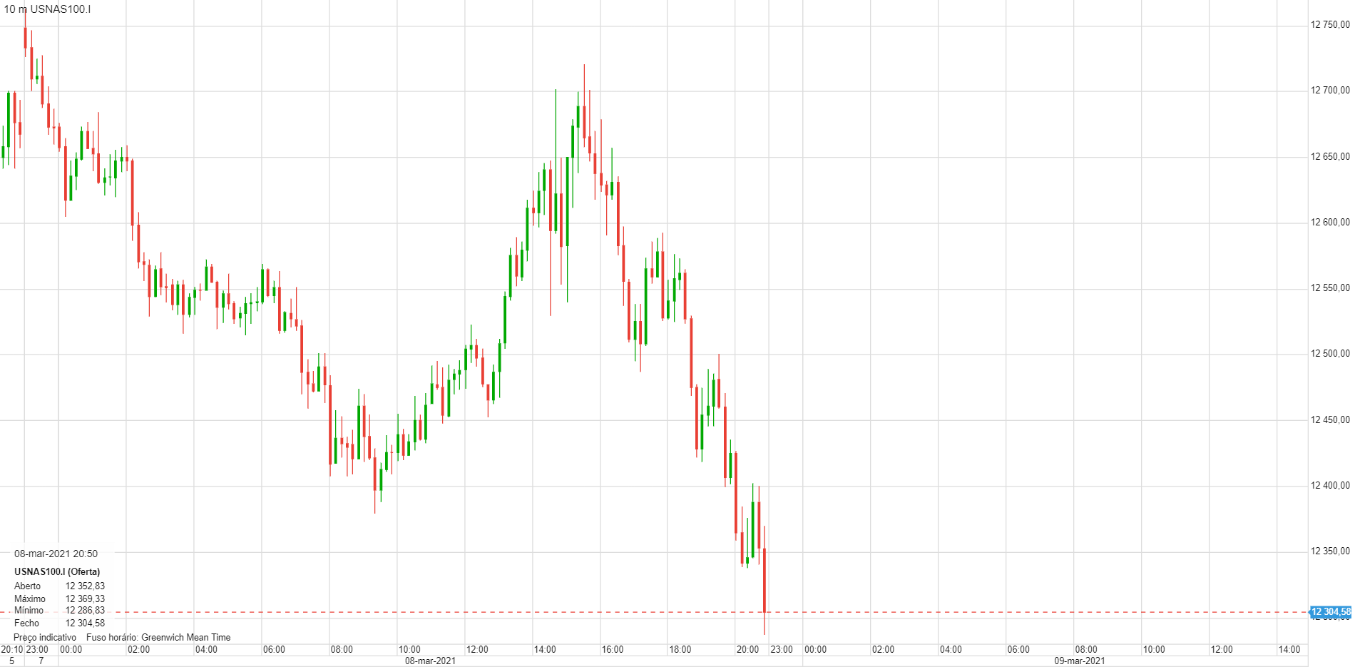 2 Março – atinge os 13.300 e faz uma barra PFR (que foi ativada no dia seguinte). Cai cerca de 1.100 pontos (zona azul) até aos 12.200 pontos.