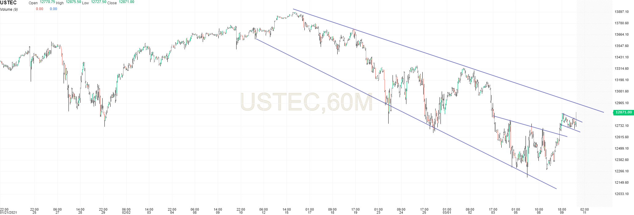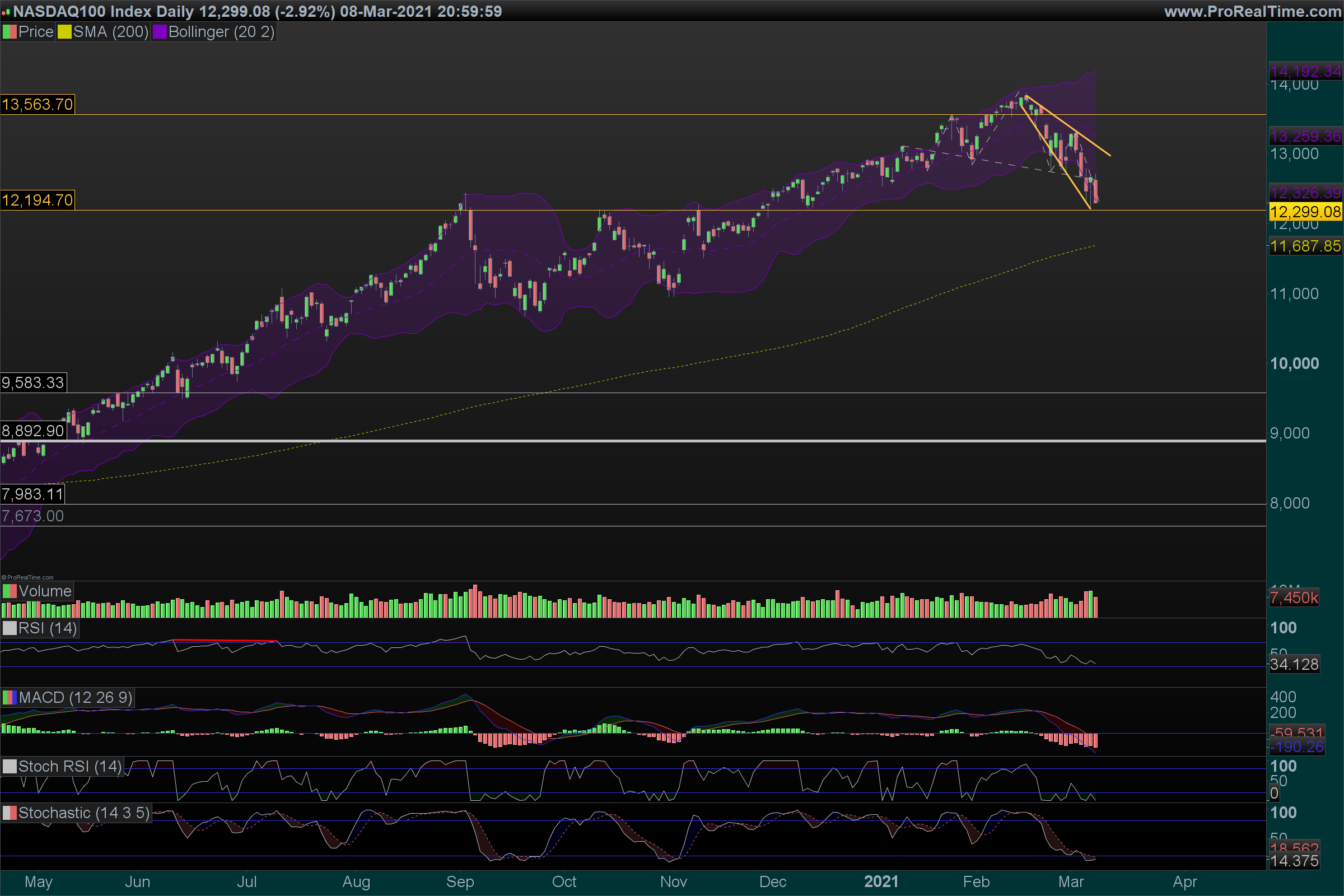 6 Fevereiro - Faz o máximo de 13.880 e uma barra PFR (que foi ativada no dia seguinte). Cai cerca de 1.100 pontos (zona azul) até cerca dos 12.760 pontos.