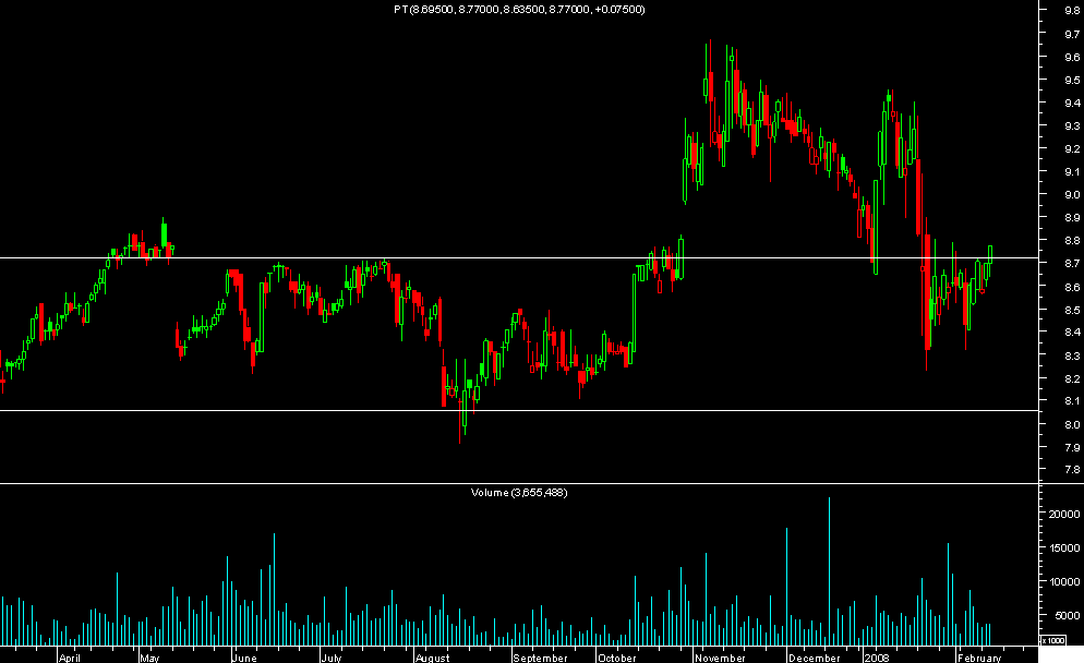 Entrar longo em acções que caem é certamente um trade de risco, pois é aquilo que vulgarmente se chama caçar fundos. É certo que o risco está bem evidente numa entrada longa na PT, pois a sua tendência é claramente descendente em todos os horizontes temporais. No entanto, quanto temos uma acção a transacionar num canal tão bem definido, penso que se devem cumprir as regras de trading para negociações dentro de canais, ou seja, vender nos limites superiores e comprar nos limites inferiores.