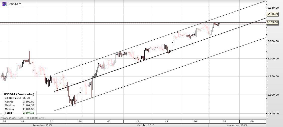 Acredito que possa haver amanha uma pequena paragem neste ponto, até porque hoje o preço já esteve perto dos 2120, mas continuo convicto que estas pequenas paragens ou pequenas tomadas de mais valias deverão ser aproveitadas para comprar, uma vez que acredito que iremos visitar máximos históricos no curto prazo neste índice tal como no NDX.