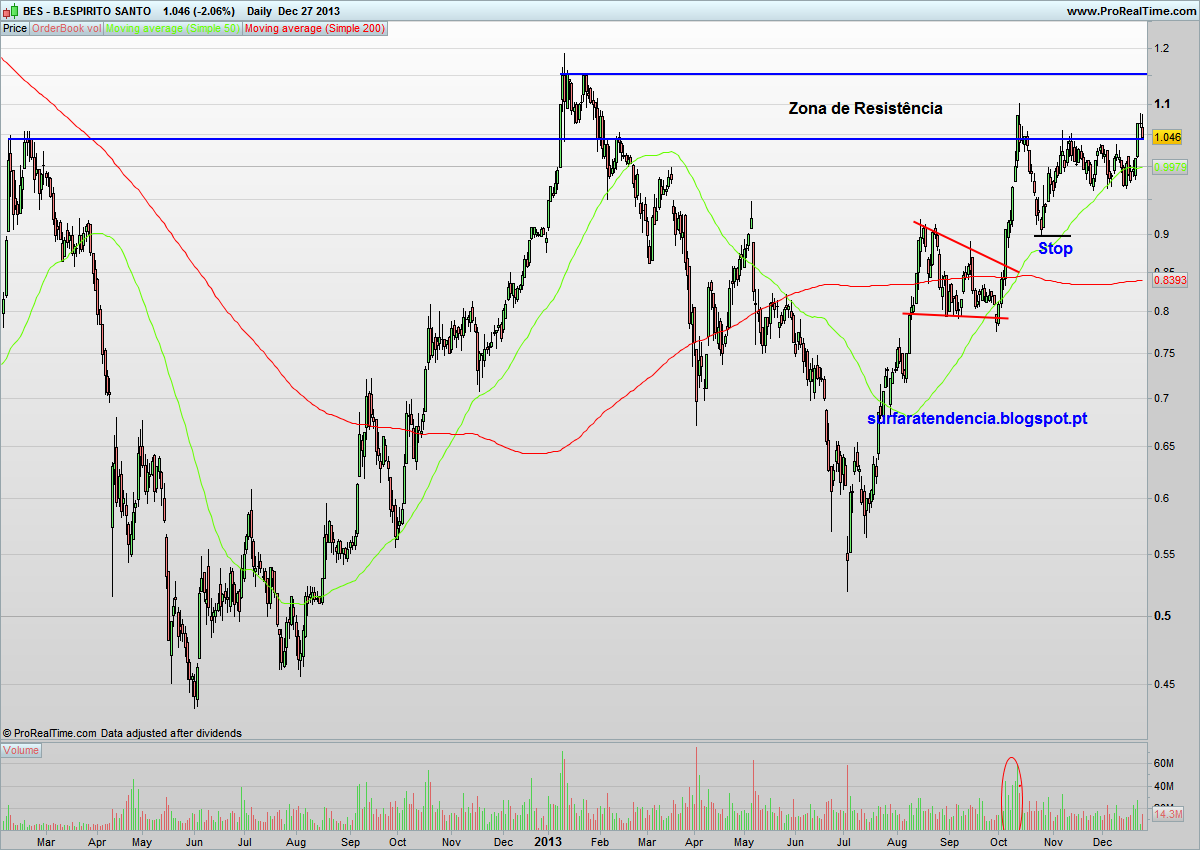O BES foi o vencedor da sondagem semanal, novamente por maioria absoluta. No último update que lhe foi feito, em finais de Outubro, tive oportunidade de alertar para a possibilidade de se vir a gerar um congestionamento antes do ataque à zona de resistência. Dois meses depois, a lateralização mantém-se... tal como a minha confiança na quebra desta zona no médio prazo.