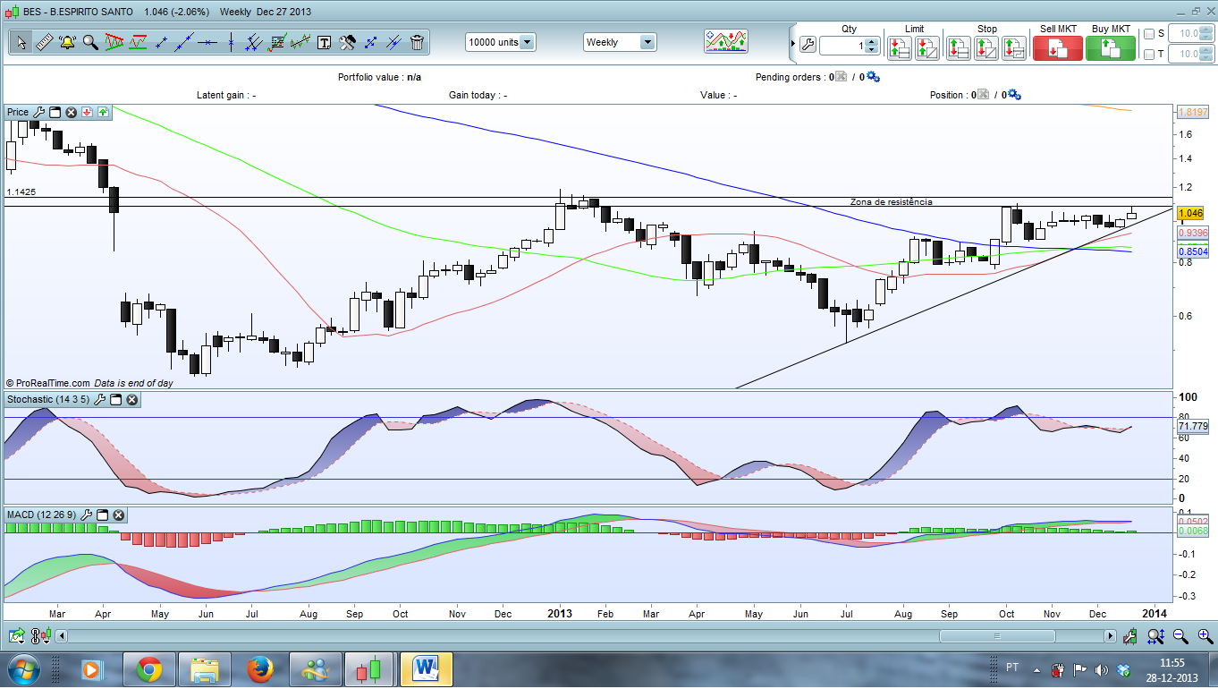 No semanal, continua a tendencia positiva desde Junho/Julho,embora haja uma zona de resistência ainda nao ultrapassada, que nao foi ultrapassada o ano passado e que foi o inicio de quedas fortes em inicios de 2012. A MACD e estocastisco estao com bom aspectos tal como as medias moveis
