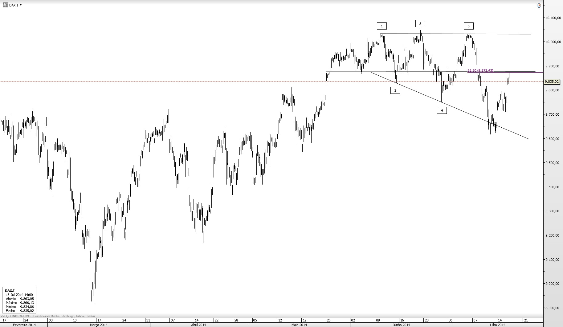 Essa zona dos 9870 pode não ir já cos pitos pois tem pra aí umas medias moveis e corresponde aos 61.8% de fibo será normal q haja tentativa de travagem