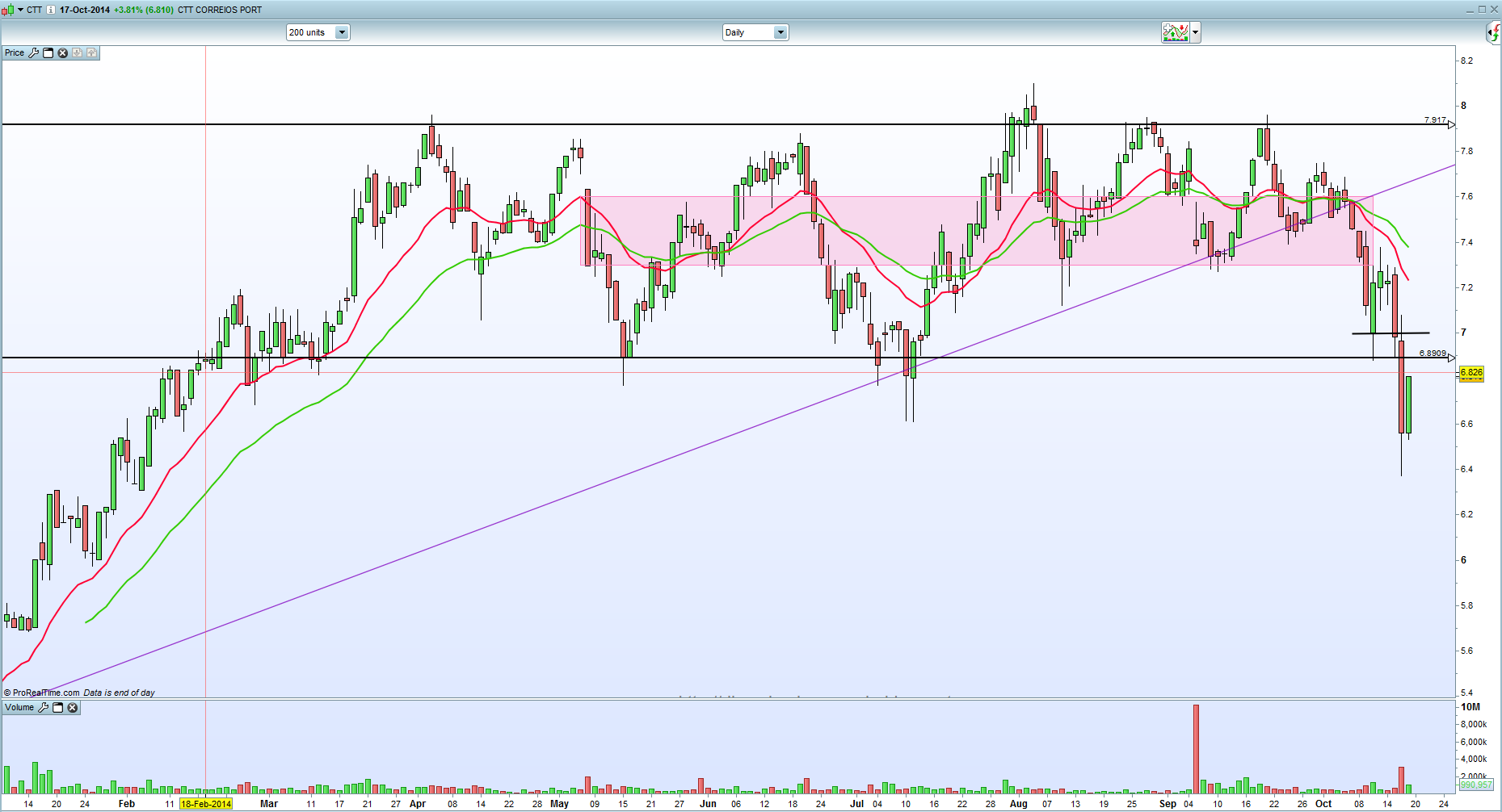 Esta acção é muito certinha... tem andado em lateralização entre os 6,80 e os 7,80. Dá para ganhar dinheiro com pouco risco, tem poucas oscilações. Vamos ver... fechou quase em máximos depois de ter estado o dia todo negativo, o volume tambem foi superior aos ultimos dias, julgo que o caminho é para cima