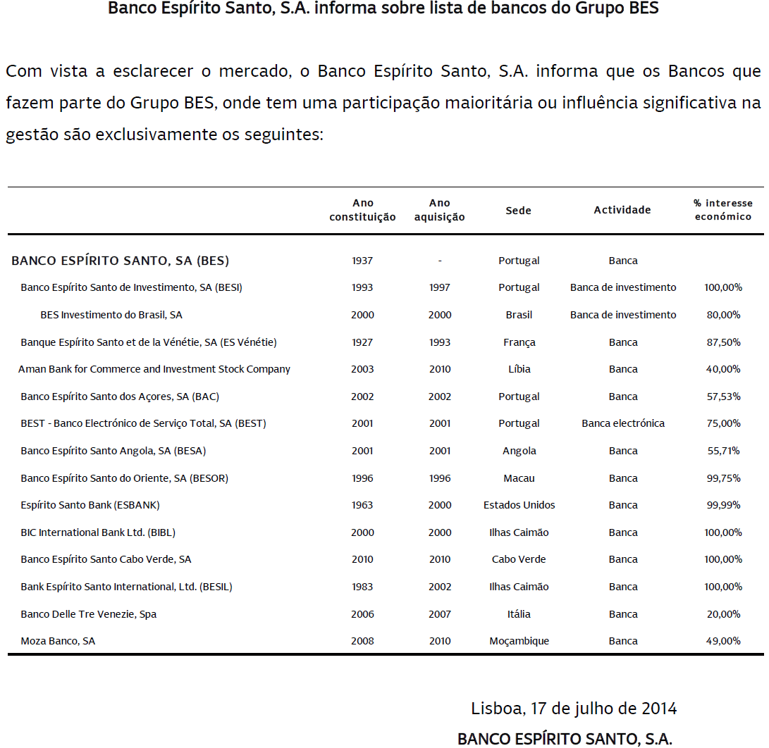 Fonte: Comunicado do Banco Espírito Santo, S.A. (17/07/2014)