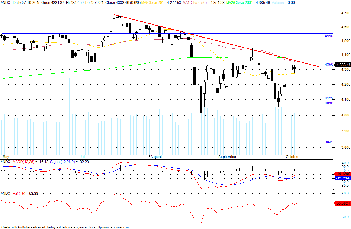 3º Olhando para o gráfico do Nasdaq 100, considero que este rally é apenas a sub-onda 2 correctiva, da onda 3 do ciclo que descendente que se iniciou em Agosto, e que a sub-onda 3 se deverá iniciar nos próximos dias trazendo novos minímos e contrariando a expectativa de todos. A sustentar esta crença temos preço na zona dos 4300 de resistência/suporte no passado, preço sob LTD que vem de Julho e sob MA50 no gráfico diário, divergências no momentum e RSI a quebrar a LTA que vem desde o inicio do rally.Survey Results for Week Ending 10/7/2015