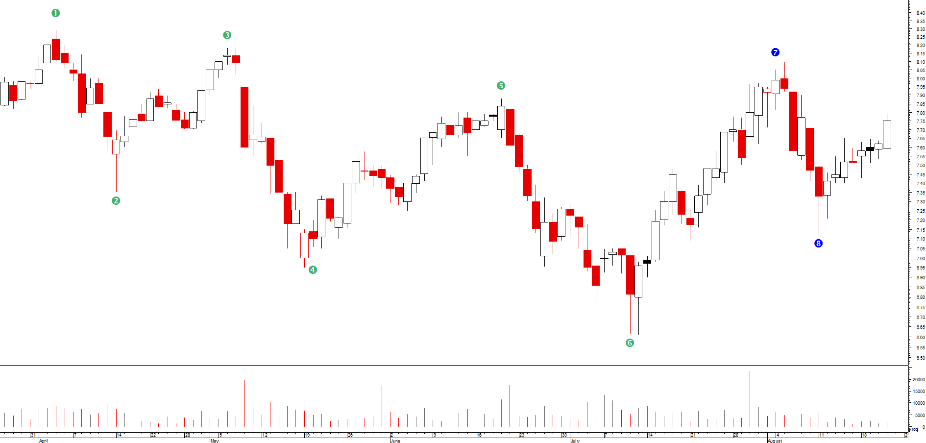 deixa-me ilustrar isto: se vires, tens uma sequência de altos e baixos sucessivamente mais baixos - respectivamente 1-3-5 e 2-4-6, mas depois disso o 7 é um higher high, ou seja, é um alto mais alto que o anterior, e o 8 é um higher low, logo, a tendência (descendente) inverteu