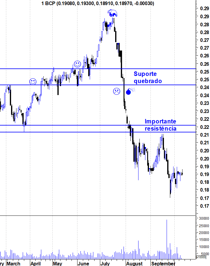 Não há grandes novidades em termos técnicos. Deixo os gráficos actualizados onde se vê bem as resistências que o BCP tem pela frente. Claro que poderia falar ali na resistência que se criou em torno dos 0,192 mas a resistência mais relevante situa-se bem mais acima.
