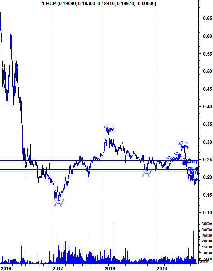 o BCP provavelmente vai continuar a melhorar os rácios NPE/Crédito, o qual era o principal calcanhar de aquiles, e provavelmente vai melhorar resultados YoY (esperemos que sem contabilidade aldrabada e sem muitos efeitos não recorrentes!), mas isso tem acontecido há muitos trimestres e não se tem reflectido na cotação do BCP, aliás, nenhuma notícia positiva intrínseca apenas ao BCP parece interessar muito ao mercado.. pelo contrario, a taxa de juro BCE, o abrandamento económico dos motores europeus, a crise de Italia, o Brexit, os créditos em francos suíços, enfim, qualquer coisa negativa é suficiente para baixar o preço da cotação em 10% ou 20%..