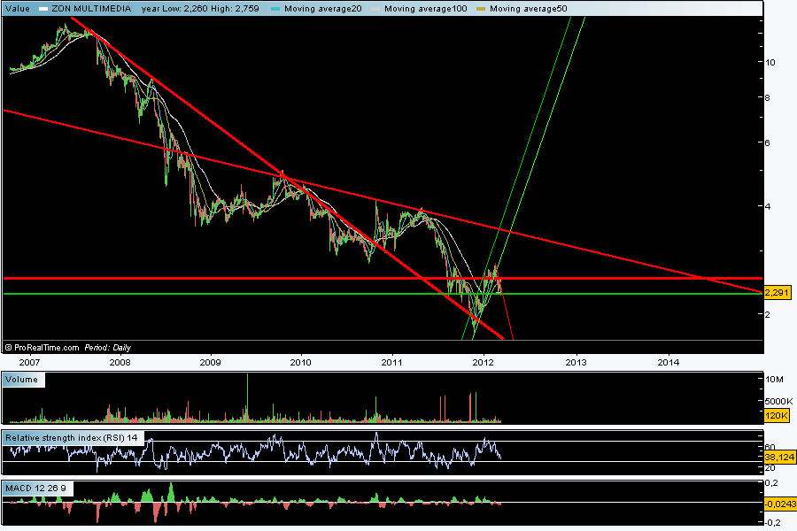 No início de Novembro de 2011 assistimos ao início de uma fase bastante promissora na ZON, principalmente após a quebra em alta da sua Linha de Tendência Descendente (Ltd) de médio prazo em finais de Dezembro. No entanto, logo a seguir a esta fase eufórica a cotação mergulhou numa espécie de letargia, com o título a oscilar desde Janeiro entre os € 2,30 e os € 2,70.