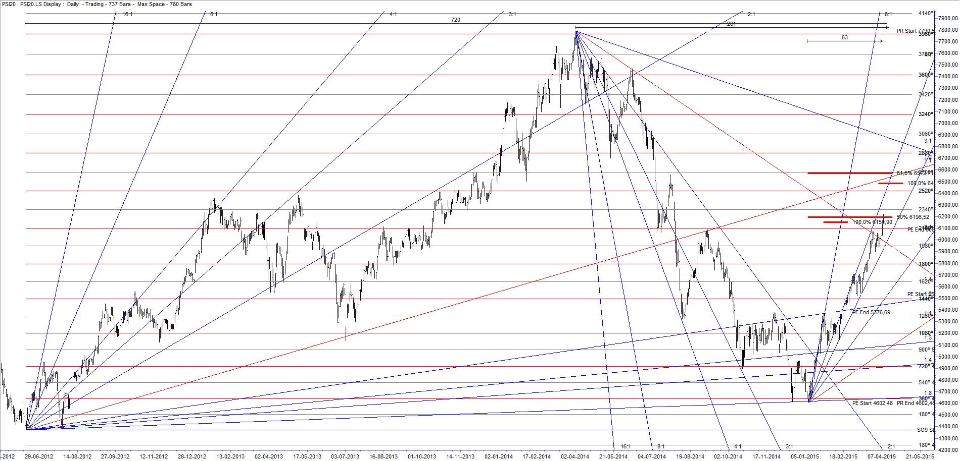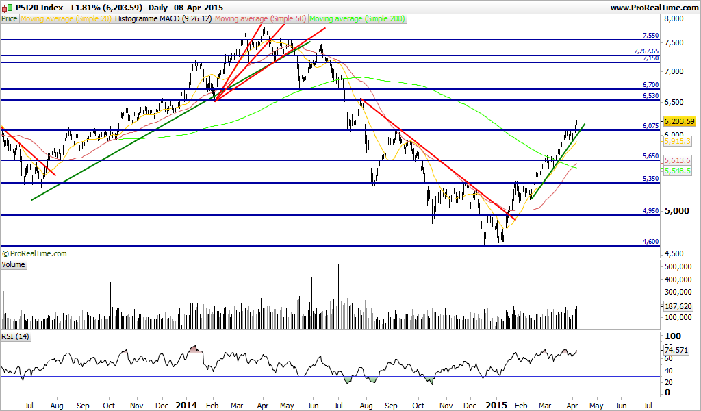 #PSI20 (2015-04-08) Nesta sessão, o índice fechou dentro na primeira zona e o máximo quase chegou à projeção do triângulo apresentado, publicamente, no dia 2 de abril.