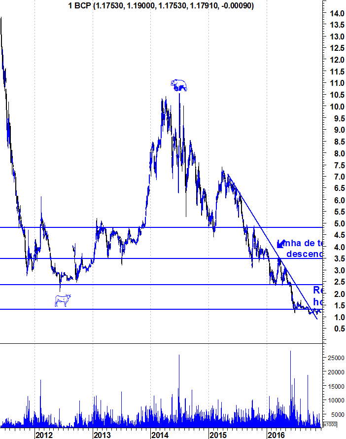 O BCP continua o seu calvário. Se ultrapassar a resistência entre 1,32 e 1,34 o potencial é enorme, mas enquanto isso não acontece o BCP continua sob domínio dos ursos. Um domínio intenso que faz com que a acção esteja quase em mínimos históricos. Para quê complicar? Esperar pelos sinais de força.