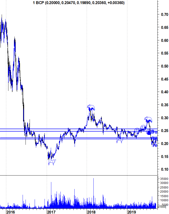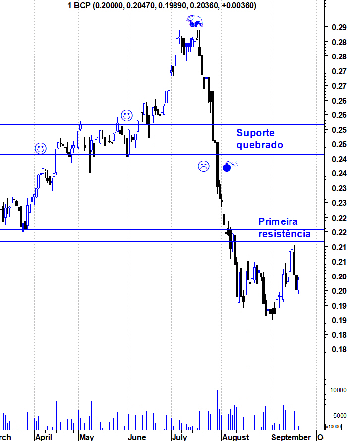Deixo os gráficos actualizados do BCP onde é cada vez mais clara a primeira resistência que a acção tem que vencer para dar um primeiro sinal de força.