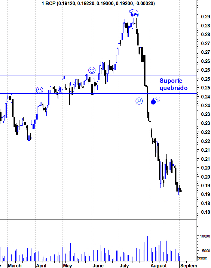 É por isso que sou fiel à análise técnica. Falível como é no caso do BCP onde, há 2 meses atrás, os sinais eram positivos. Mas na quebra do suporte dos 0,246 não havia que hesitar dado o claro sinal de fraqueza e inversão de tendência que isso significava. Mesmo que apenas mais tarde percebamos o porquê.