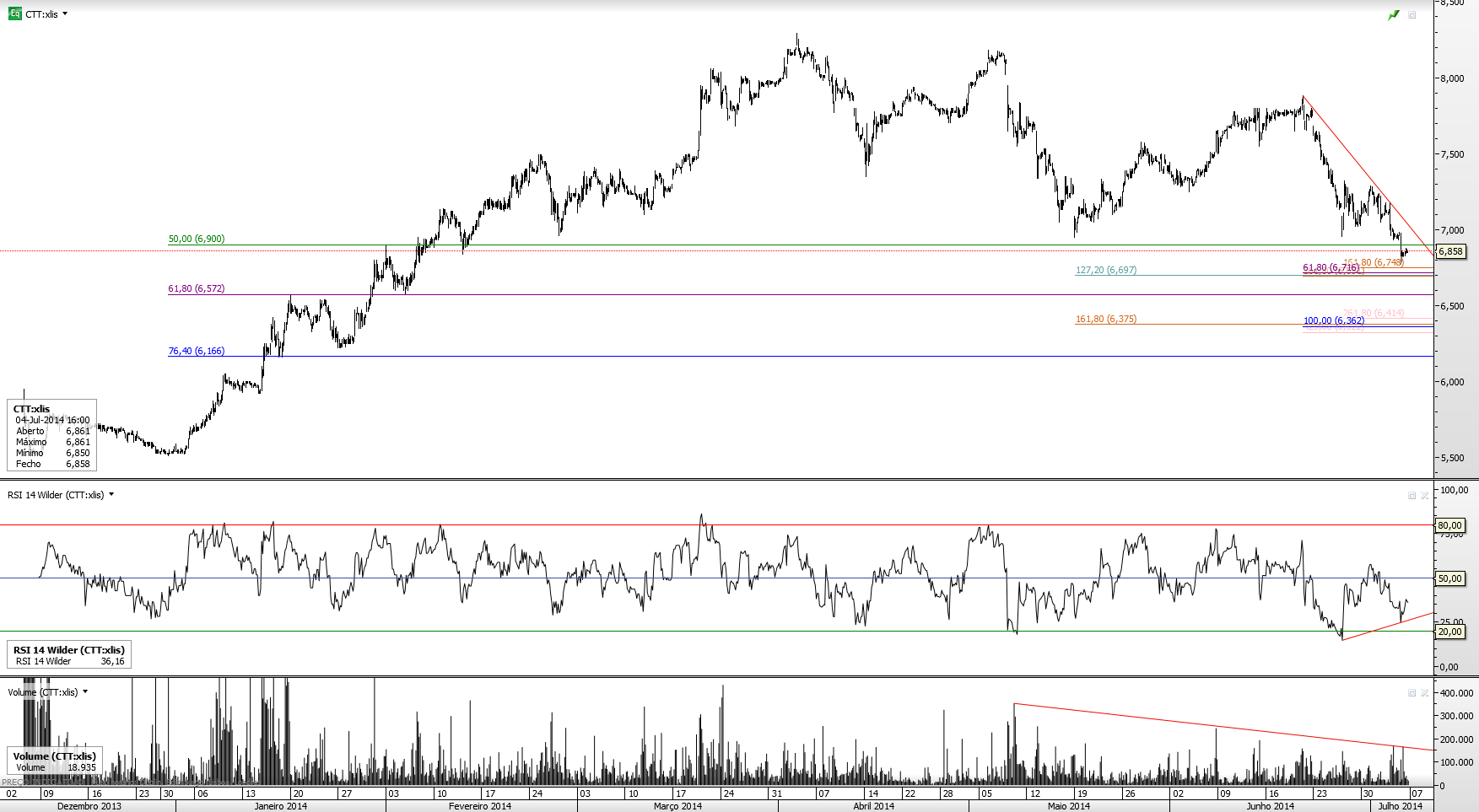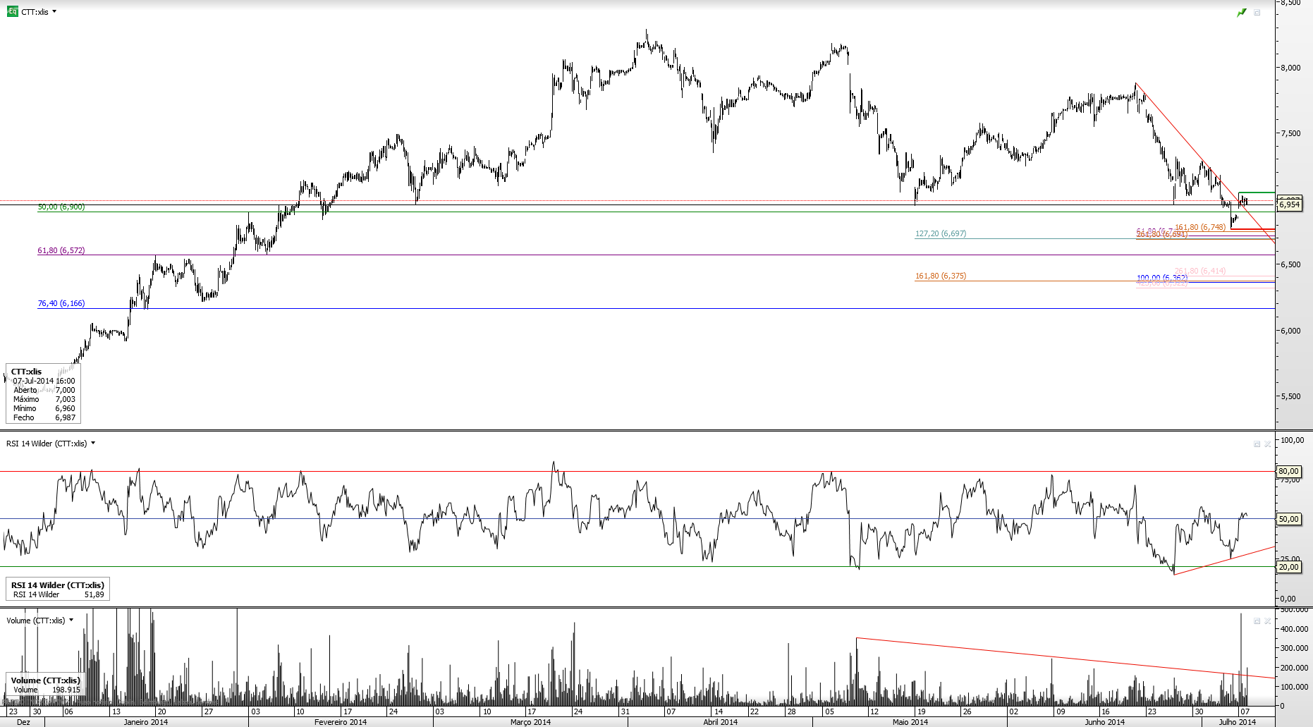 Sou novo por aqui. Concordo com as opiniões expressadas. Penso que o CTT está num canal baixista que "poderá" servir para consolidar seus valores. Avaliando a combinação entre os MACD, RSI, Estocástico e Williams %R (são os 4 indicadores que costumo apreciar em combinação entre si) concordo também que podemos ter operações no curto prazo com entrada pelos 6,60/6,80 e saída pelos 7,10/7,30, até que a cotação rompa com volume a base ou teto desse canal.