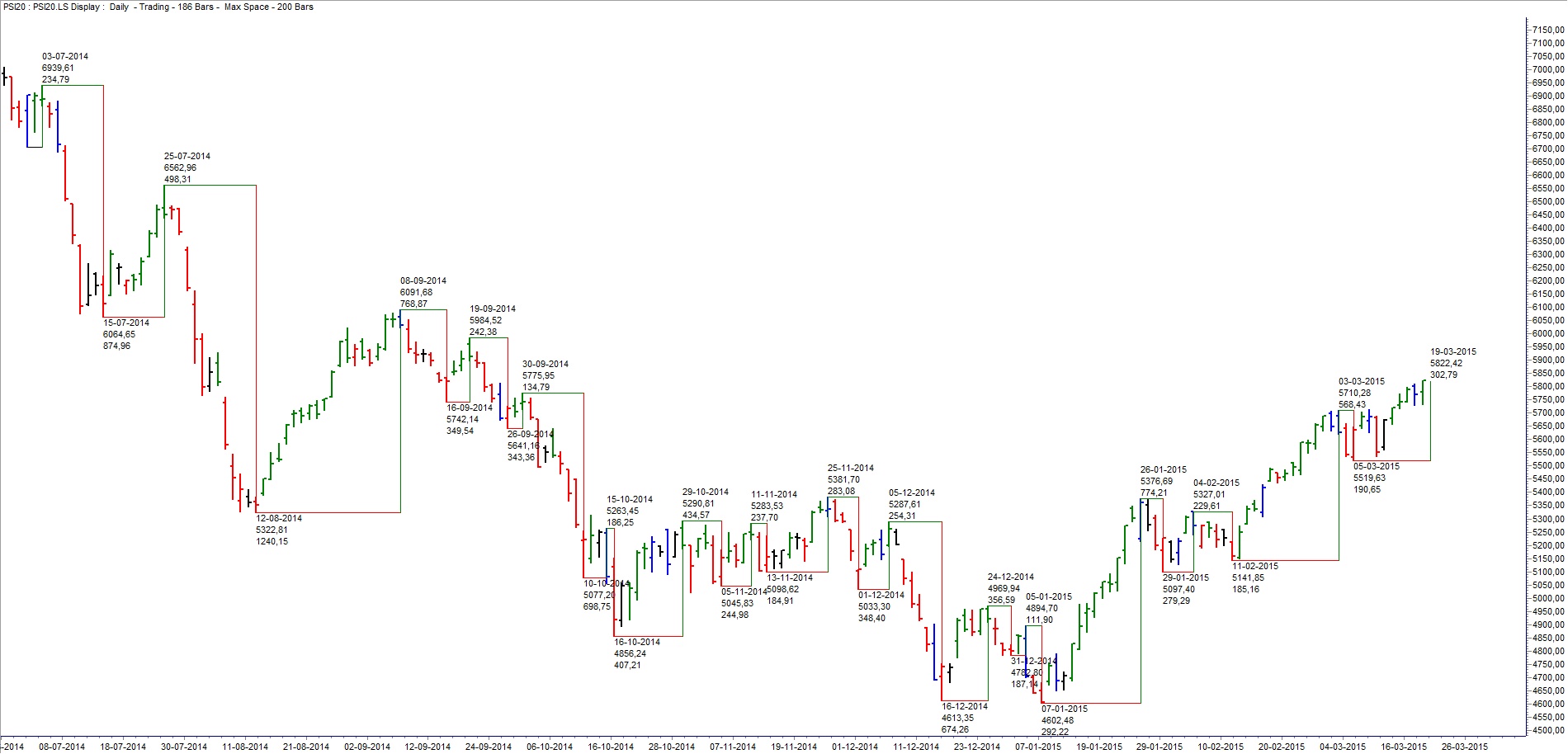 outra coisa que é preciso entender é que prazos negociamos. contra mim falo neste caso pois tanto comento situações de longo prazo como de curto prazo mas o facto é que para mim só me interessa o curto prazo. rarissimas vezes tenho posições por mais de 3 meses. raras vezes tenho posições por mais do que 2 ou 3 semanas. dito isto, acho fundamental ter uma opinião/ideia sobre os rumos de escalas superiores para saber com o que posso contar e dosear as minhas entradas contra ou a favor das tendências conforme a análise de risco que tem com base a fase do mercado, a tendência de fundo, niveis de entrada e saída e outras indicações técnicas ou subjectivas/empíricas.