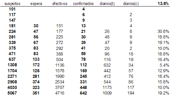 MarcoAntonio Escreveu:Quanto à percentagem de positivos, na última batch foi de 19% (na batch anterior tinha sido de 10%). A média global está em 13.6%.