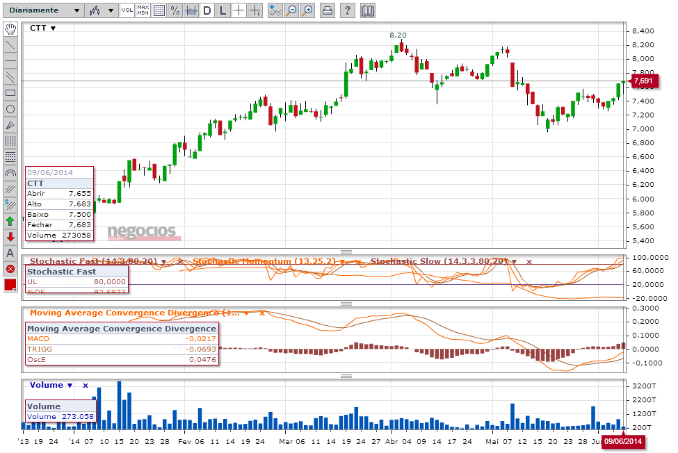 Desde o dia do bullish-engulfing 04-06-2014 tenho vindo a alterar o meu stop mental para 0,10€ abaixo do mínimo de cada dia, até que chegamos ao dia de ontem 09-10-2014 e me começam a surgir as dúvidas em relação à cotação, apenas pelo facto de se ter aproximado da resistência dos 7,7€ com um volume fraco.