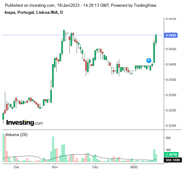 Li, mas há alguma coisa relacionada com a compra na Alemanha que ainda não percebi completamente. Suponha que daí resultam essas tais ações preferênciais. Digo, suponho... Tecnicamente parece querer ir para cima, daí ter feito uma pequena compra na perspetiva de vender perto de 0.07. Mas... estou com olho no burro e outro no cigano... a ação está esticadíssima com um RSI de fazer desconfiar.