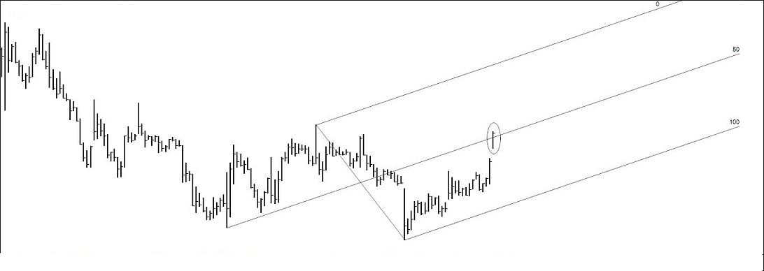 Dado que o preço não se dignou penetrar na área seleccionada nem foi à linha, única circunstância que justificaria a compra, já que aqui não se corre atrás do preço, sobe-se a linha de referência e espera-se novo toque que, além do mais, respeite o r:r 1/3. Caso o preço toque na median line sem que a compra seja activada, a oportunidade, tal como foi construída, chega ao fim, e outra se desenhará.