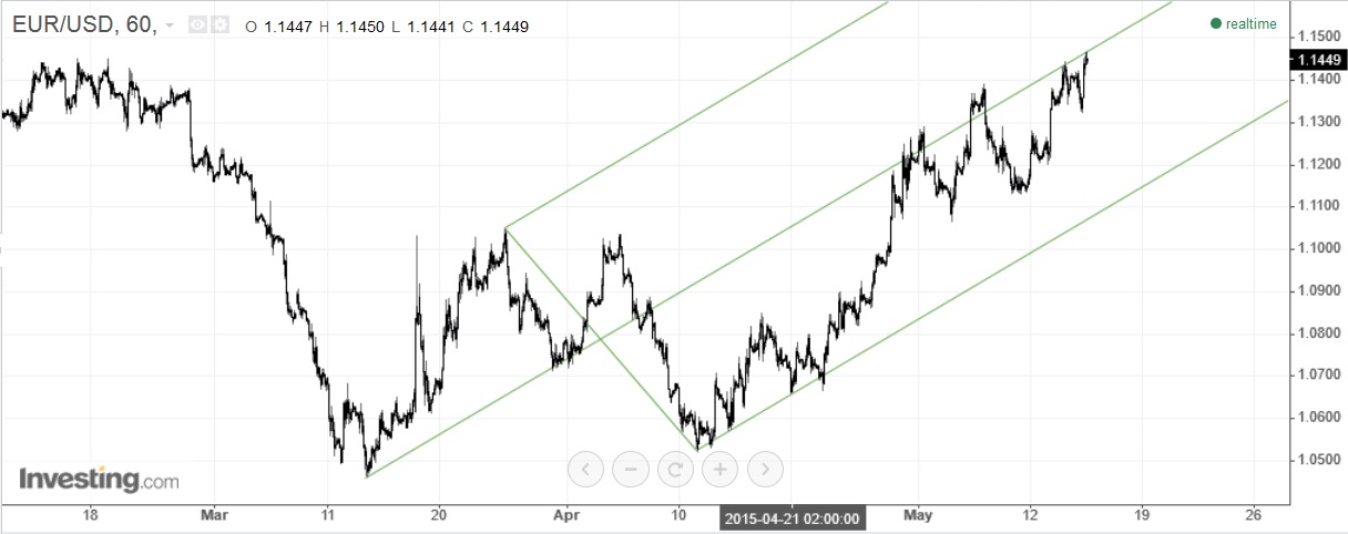 no eur/usd é isto que vejo: preço em zona de conhecida resistência, fork "what if" com um certo ar, indicadores num canal descendente há já uns dias (ainda para mais com o rsi a descer da zona dos 80), razões suficientes para estar de olho num eventual curto.