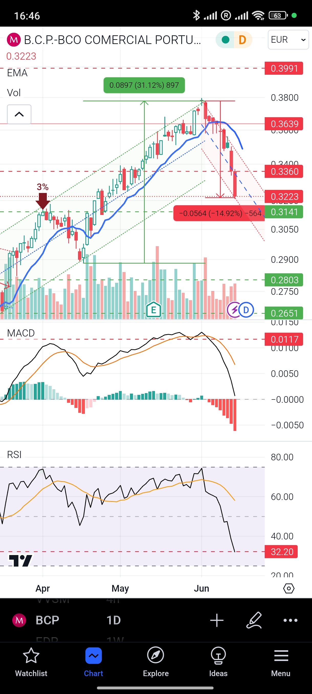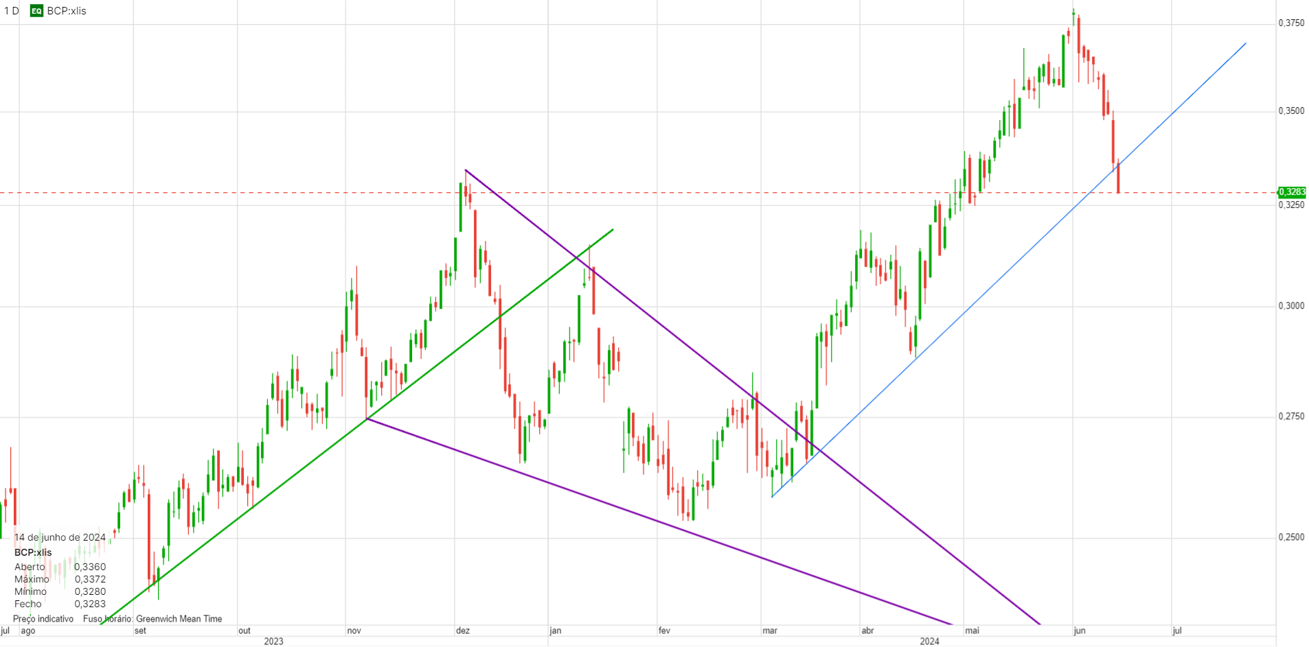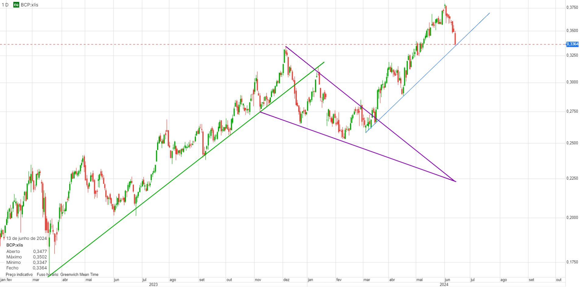 Depois de uma valente subida de 30% em 2 meses, e uma correção de 15% (para já) em junho, não resisti a entrar no BCP.