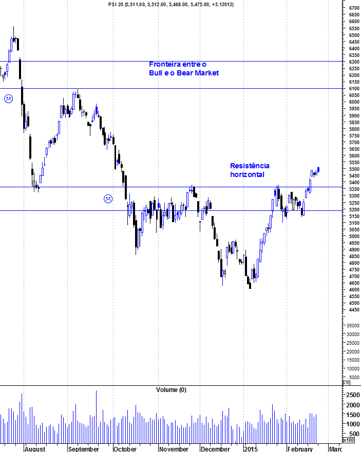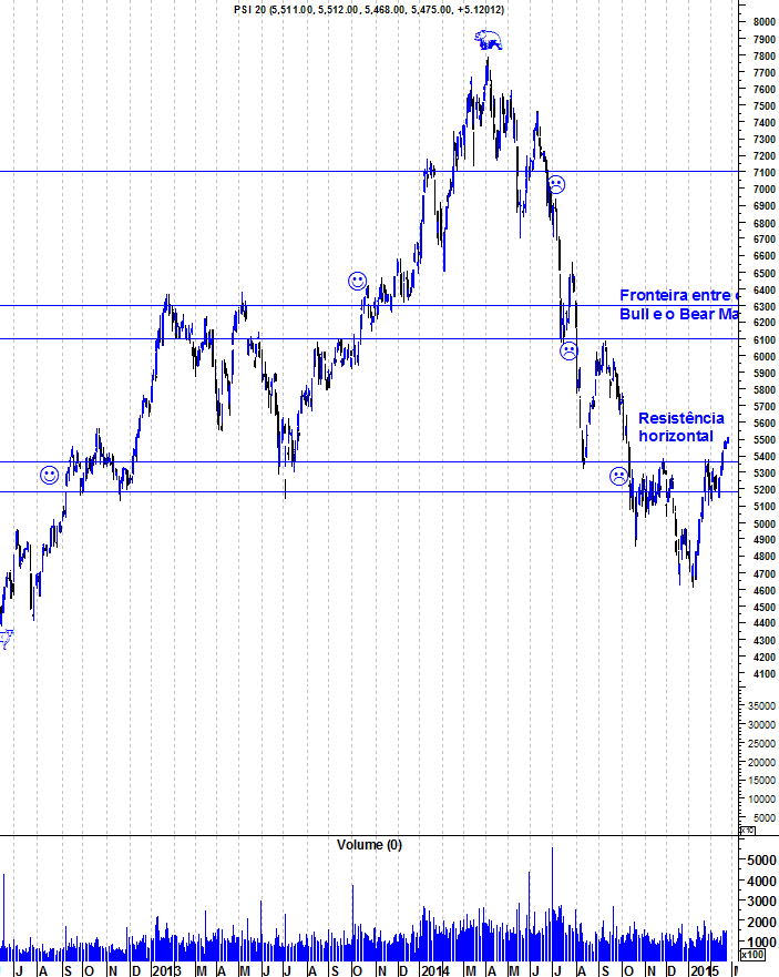 Aqui ficam os gráficos actualizados do PSI numa altura em que o índice procura confirmar a quebra da resistência entre os 5350 e os 5400 pontos. O cenário ideal para os touros seriam alguns dias de consolidação em torno desta zona antes de procurar retomar o caminho das subidas. Mas nem sempre o mercado faz as coisas tão certinhas...