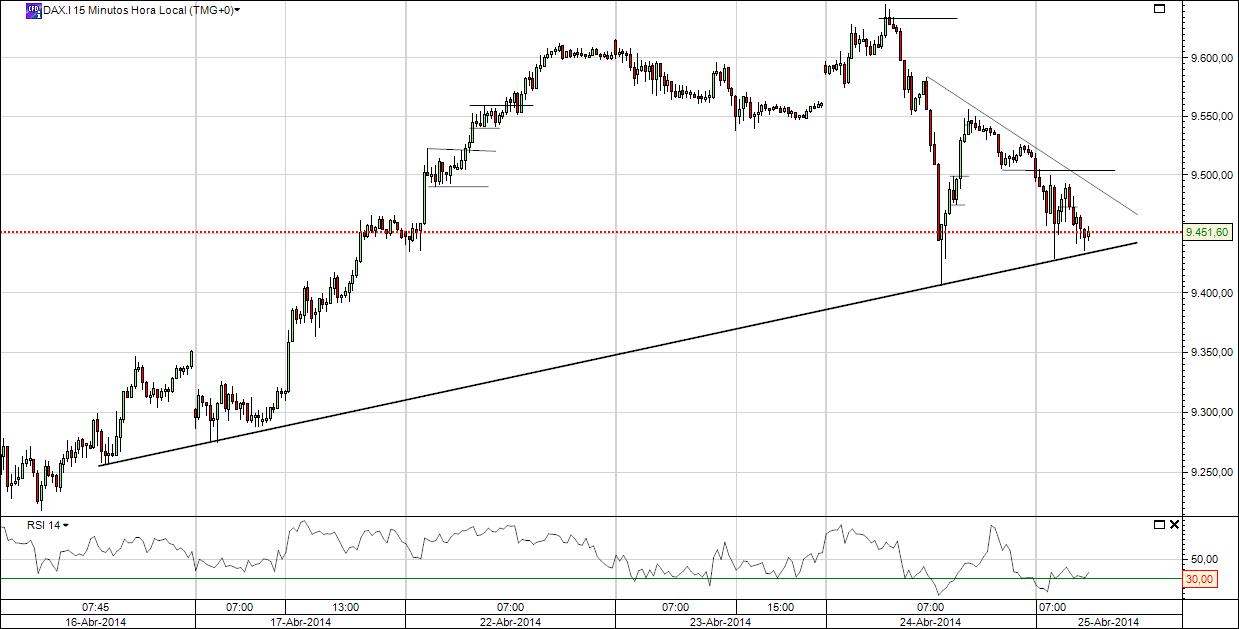 Eu já não vou tanto pela expectativa de que suba. Entrei curto logo depois da abertura e na realidade no gráfico de 15 min, quando tocou na Ltd superior voltou a cair. Não procuro apanhar estes suportes e resistências pois isto tornava-me escravo do computador. Apenas escrevo agora para alertar que os futuros dos SPX aprofundaram a queda, o que pode significar que depois da abertura dos States , o Dax pode vir a cair mais.