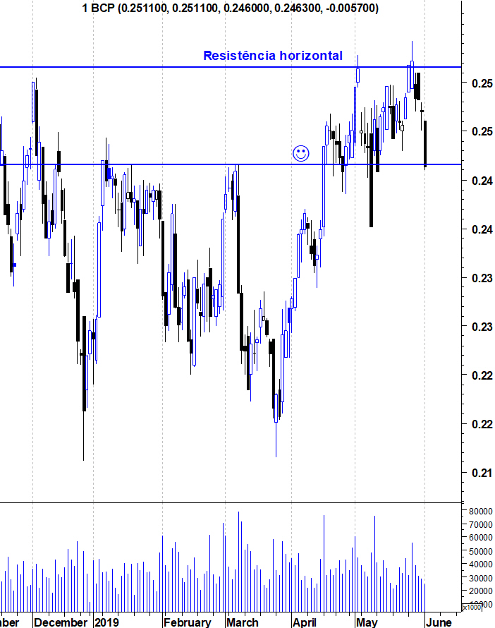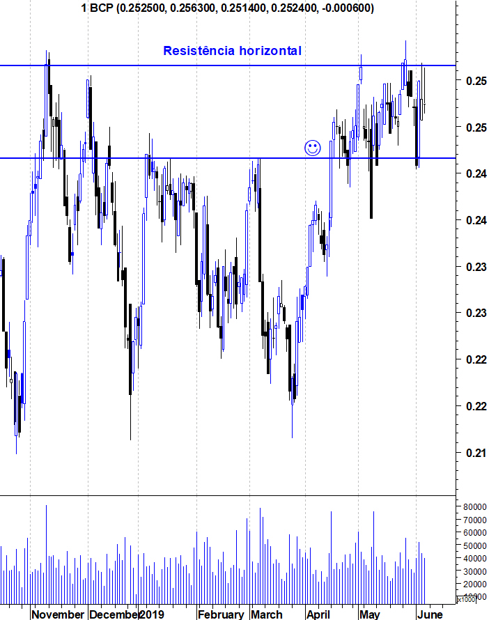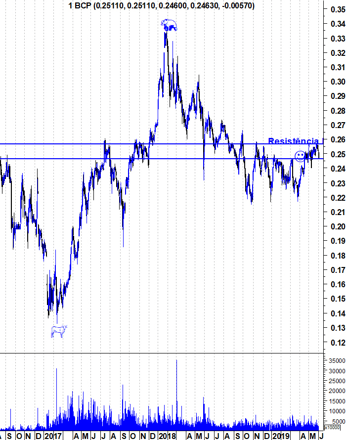 Mesmo a tocar na resistência. O BCP recuperou a confiança e não fosse os outros problemas no setor financeiro os investidores já teriam recuperado também as suas posições.